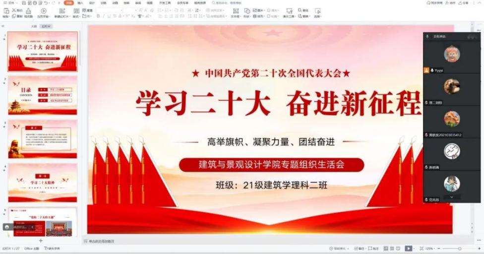 建筑与景观设计学院各团支部于11月30日线上开展“学习二十大、永远跟党走、奋进新征程”专题组织生活会。会议在庄严的团歌中开始,团支部书记汇报团支部今年开展“学习二十大、永远跟党走、奋进新征程”主题教育实践活动情况,特别是学习党的二十大精神情况和组织生活会准备情况,并结合团支部工作和个人实际交流体会认识。随后,团支部委员、其他团员依次发言,交流心得体会,分析思想道德和学习工作方面的不足及努力方向。接着,各团支部开展团员先进性评价并进行民主测评投票;最后,各团支部重温了入团誓词。