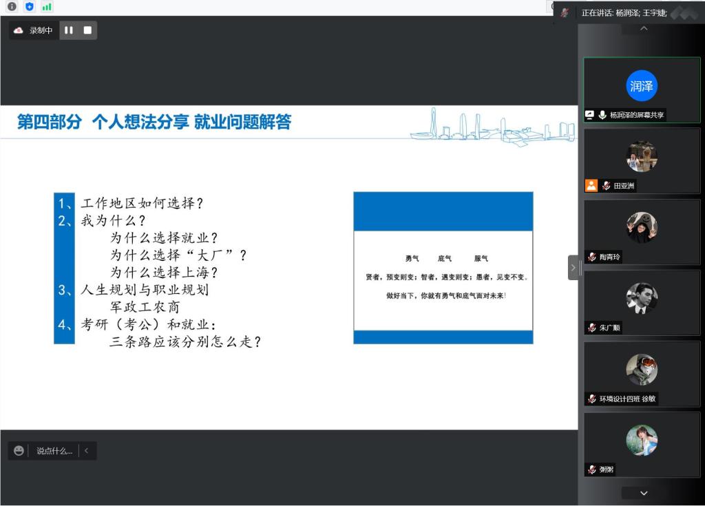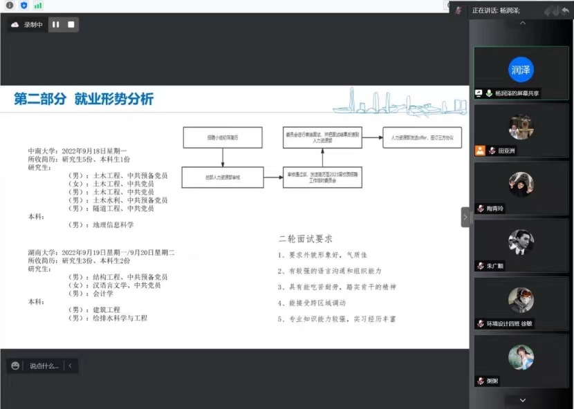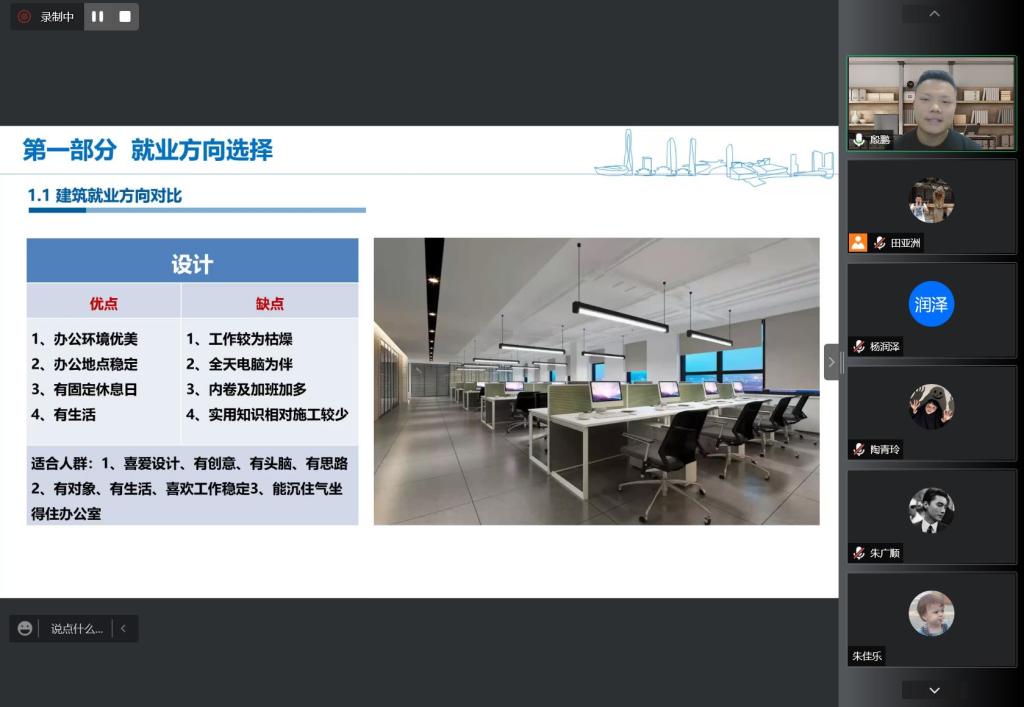 为迎接党的二十大胜利召开,帮助我院学生做好职业发展与规划,10月6日,建筑与景观设计学院举办线上就业经验分享会。本次活动由2021届毕业生殷鹏、2022届毕业生杨润泽担任主讲,2023届毕业生辅导员田亚洲主持,2023届和2024届毕业生参与。