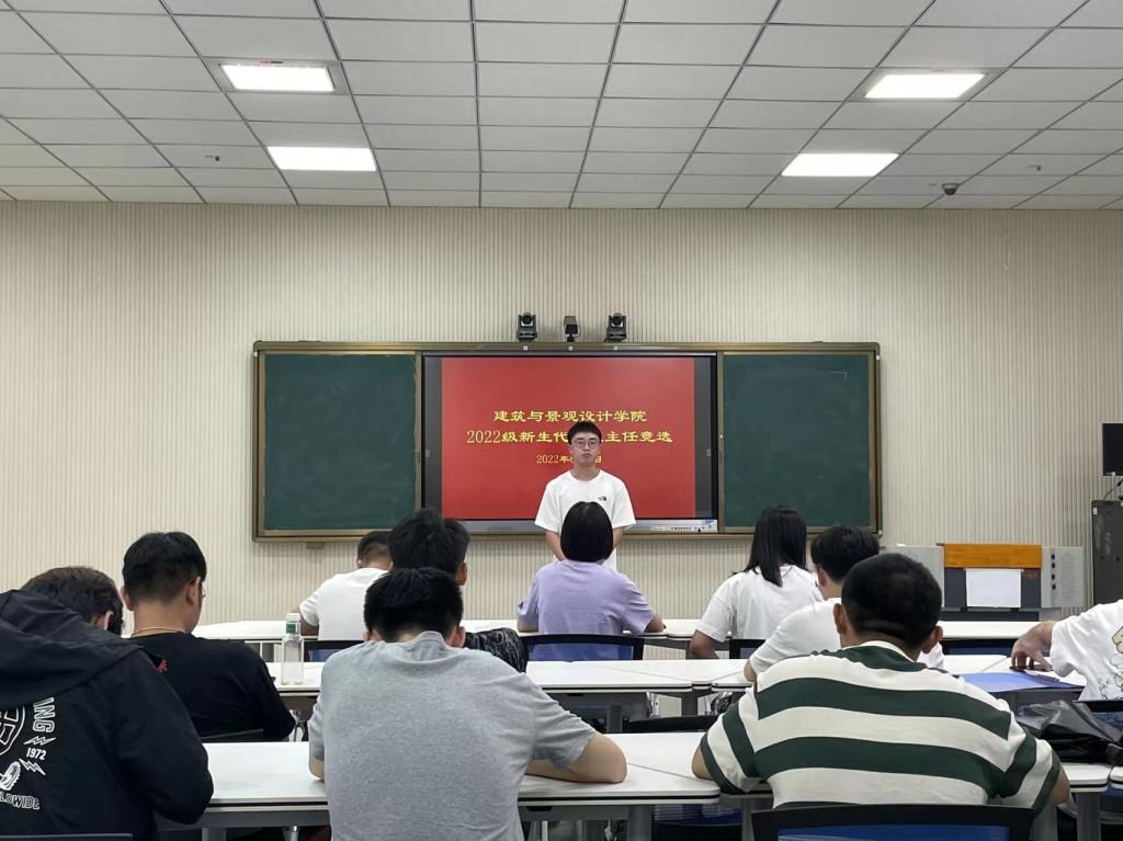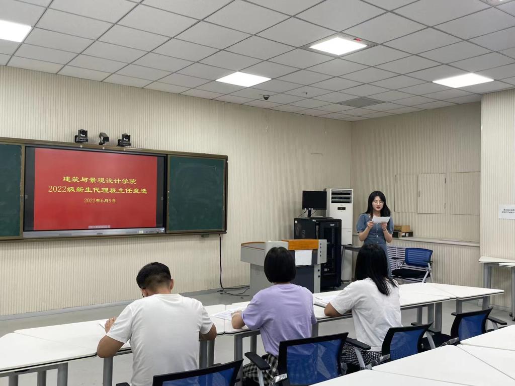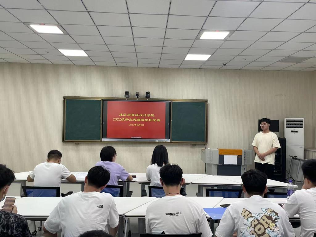 为提前做好新生入学准备,帮助即将入学的2022级新生快速适应大学的生活和学习,使他们更好的融入大学校园生活,6月9日下午,建筑与景观设计学院在智慧教室开展2022级新生代理班主任竞选大会,本次大会由学院团总支副书记褚丁庆主持,辅导员陈铁、韩晓旭参加。