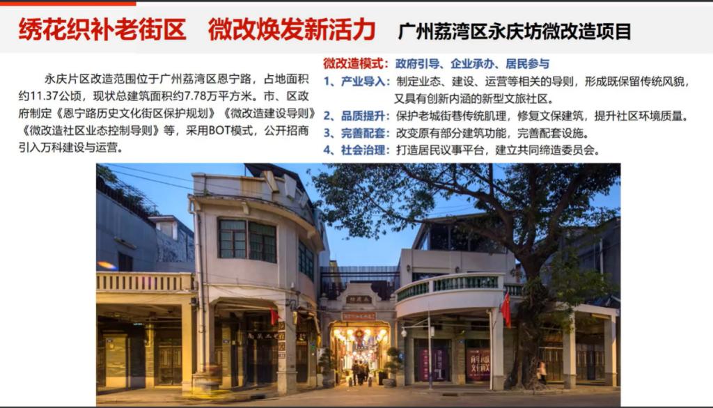骆建云介绍了广州的社区更新改造经验,包括相关政策、改造目标、更新理念、广州社区发展行动的规划策略以及社区更新的四方面成果,并结合团队在广州多年来的微改造项目实践,深入浅出地为大家介绍了城市微更新工作中的有效经验。最后,骆建云从改造模式、改造内容、改造策略等方面具体介绍了广州荔湾区永庆坊、泮塘五约和广州越秀区旧南海县三个社区微改造项目的案例。