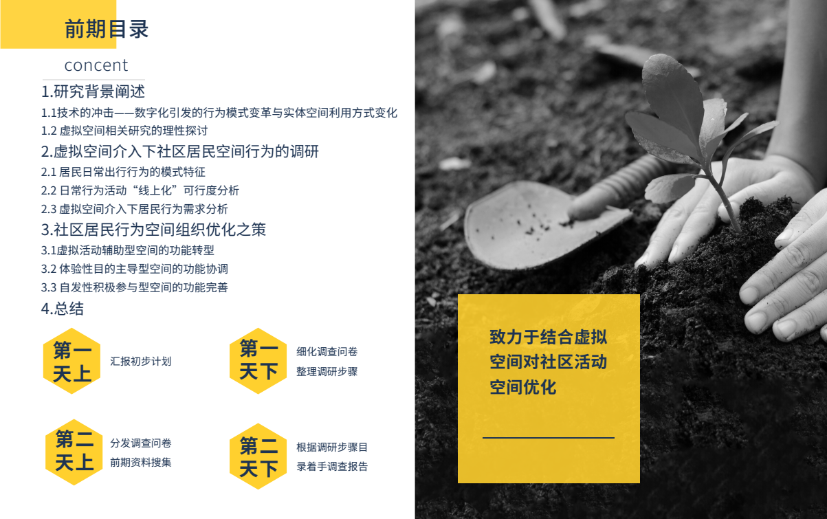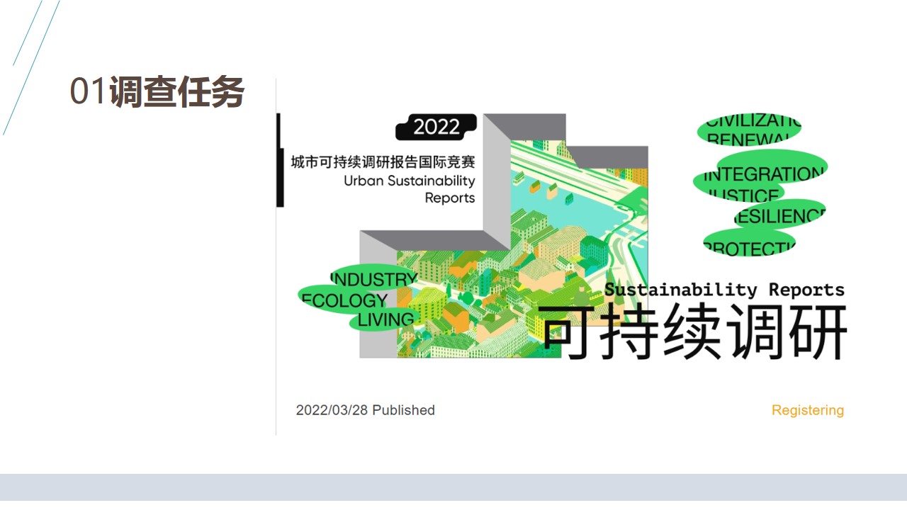 作为一门实践型课程,学生需自主选题,针对城市可持续发展和城市规划建设,在衣、食、住、行、文、体等诸多生活场景中采用调查研究的方法(如访谈、问卷、案例分析等),运用系统性思维探索客观现实中的问题和规律,展现学生对研究方法的学习和掌握。由于课程周期短,2周的时间要完成选题、定题、调查提纲和调查问卷的制定、数据整理分析、报告撰写等大量工作具有一定困难,因此朱铎在在前修课程教学期间就组织学生进行了选题讨论的预热。