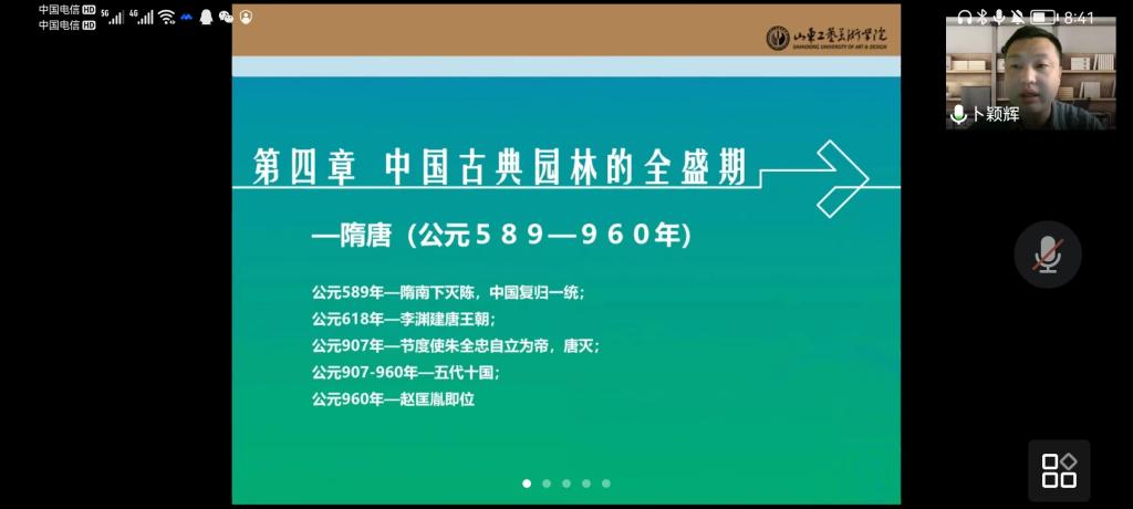 卜颖辉老师通过长江雨课堂和腾讯会议,为2021级的同学讲授了《中国古典园林史》的内容。卜老师认真备课,课堂系统讲授,并提前将录制的教学视频上传超星学习通教学平台,便于同学们做好课程预习和复习。课下,通过建立课程群在线辅导、答疑。同学们认真在线上学习,并针对在理论讲授和作业实践中的疑难问题积极与老师进行沟通。