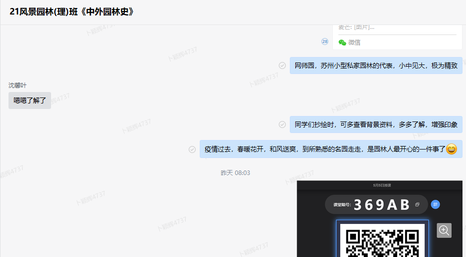 课后,同学们将根据这周课上各自的学习情况,继续查缺补漏,做好复习和预习工作。雨课堂平台可回看,易沟通,便于课后巩固所学的优势。总的来说,线上教学丰富了《中外园林史》这门课程的教学路径,给教和学都带来了全新的体验,教学效果良好。