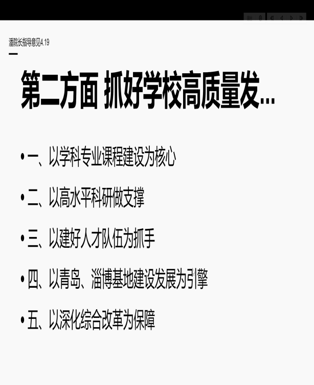 李文华从三个方面详细传达了院长潘鲁生的讲话精神。一是把握新时代设计教育的五个导向,即“为人民而设计”、“为融合创新而设计”、“为乡村振兴而设计”、“为传统工艺振兴而设计”和“为生态文明而设计”;二是抓好学校高质量发展的五个重点,分别是“以学科专业课程建设为核心”、“以高水平科研作支撑”、“以建好人才队伍为抓手”、“以青岛、淄博基地建设发展为引擎”、“以深化综合改革为保障”;三是要强化干事创业的五种意识,即大局意识、发展意识、创新意识、创业意识和担当意识。