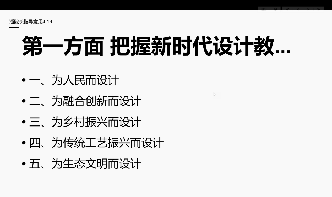 李文华指出校领导的讲话为学院的工作给出了明确的指导意见,指出了今后的努力和发展方向。全体教职工要认真梳理潘院长讲话精神,真正领会“五个导向”的指导意义,让设计学科更好的服务于国家的发展战略;真正把握“五个重点”的引领作用,早日实现全面高质量发展的总目标;真正领会“五个意识”是干事创业的关键,树立新理念,拓展新思路,创造新业绩。