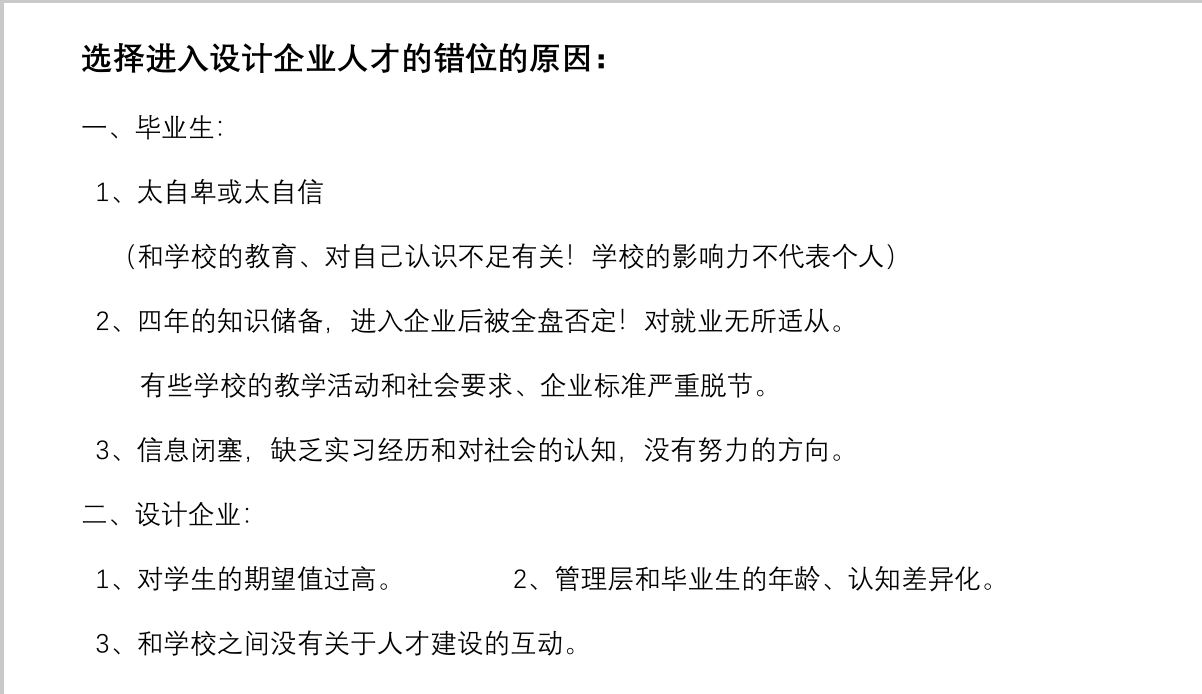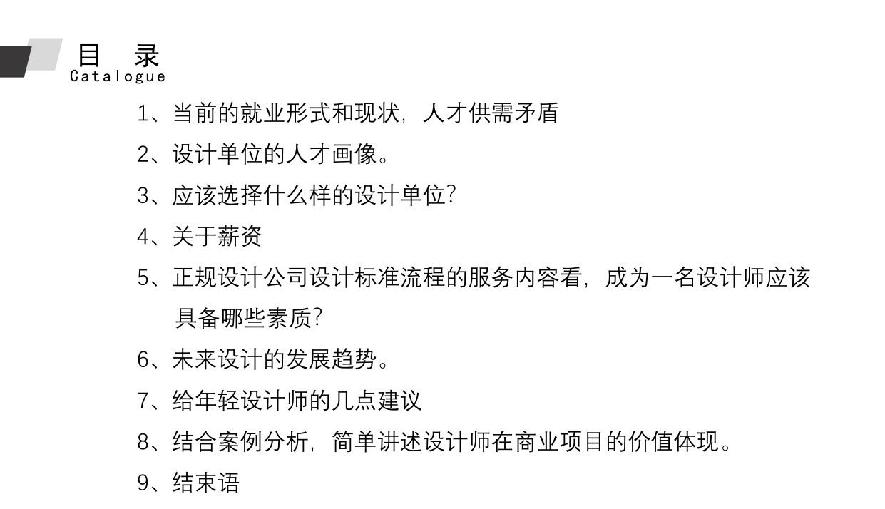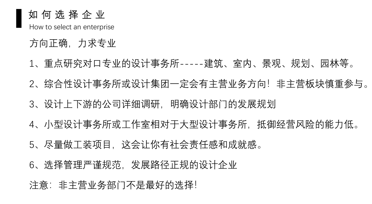 栾滨老师结合当前社会的大背景,分析了当下中国设计人才市场供需错位的现象、出现供需错位的原因以及解决供需错位的方法。提醒广大毕业生,直面问题,抓住最佳就业时间,合理调整就业期望值,适应社会和企业对人才的需求。从基础专业水平和动手能力、踏实稳定、学习能力、专业执着、清晰的职业规划等方面分析了设计单位所需的人才招聘画像,为毕业生提升自身技能和做好就业准备指明了方向。