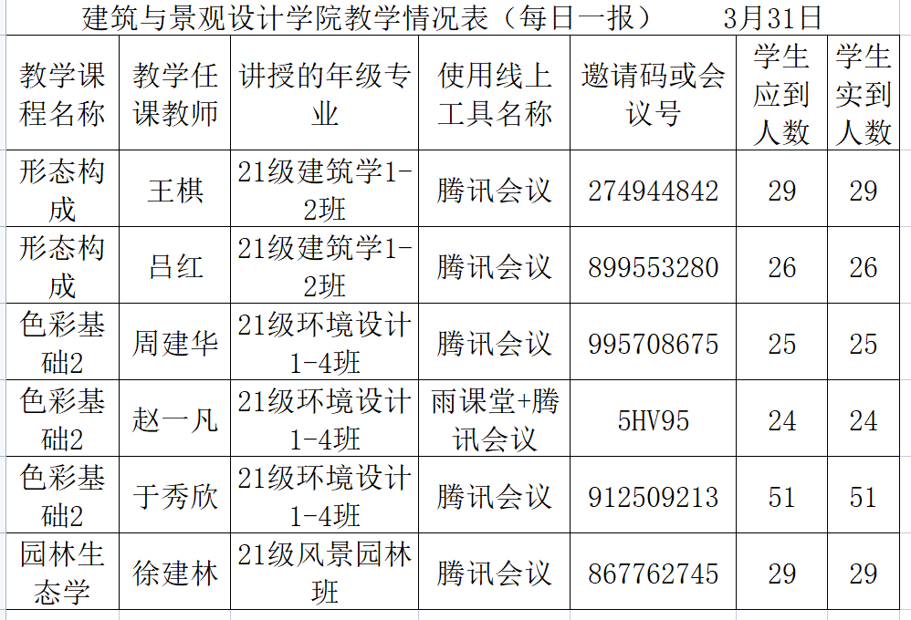 3月31日-4月1日,建筑与景观设计学院共开设《形态构成》《造型基础》《园林生态学》3门课程,周建华、于秀新、赵一凡、徐建林、吕红、王棋六位老师负责授课。2021级共175名同学参加了线上学习。教师到课率为100%,学生到课率也为100%。