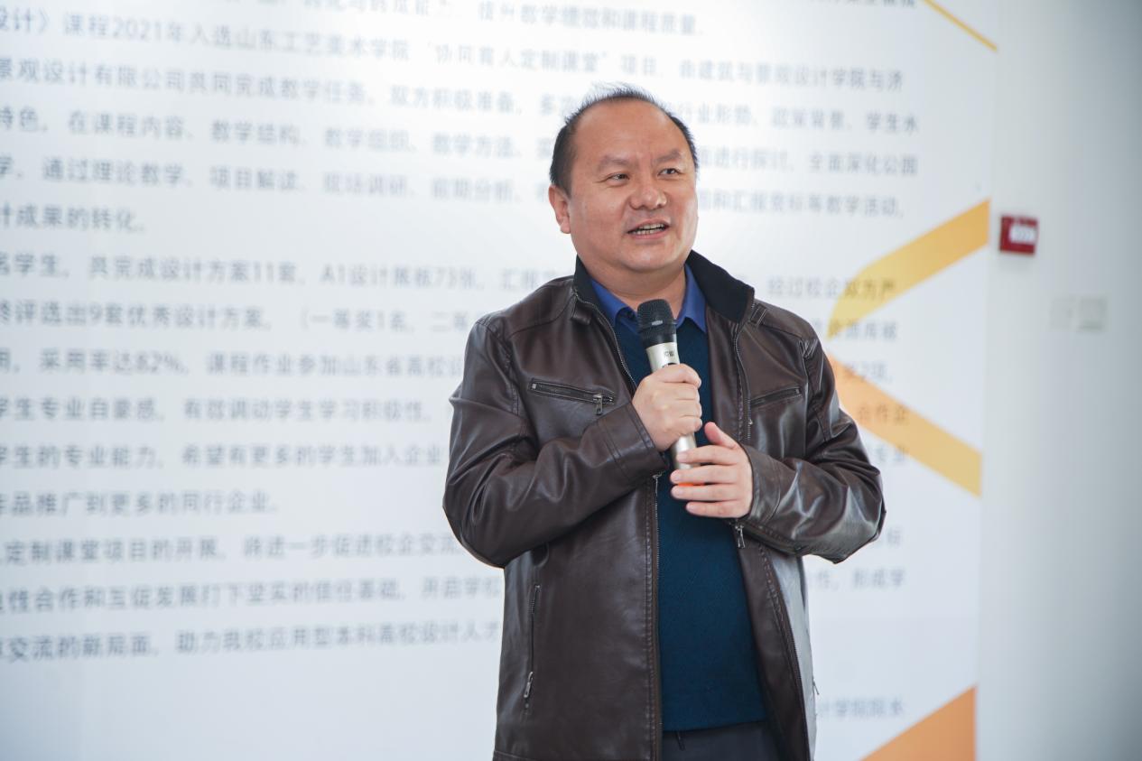 刘飞高度肯定公园设计定制课堂的学术交流活动。他代表集团对这门课取得的丰硕成果表示热烈祝贺。认为产教研融合是企业和学校合作的一个重要方向。能够把社会上的资源和高校资源进行整合,同时通过产教融合能够生动的让同学们明确图纸探讨和实际工作中的联系和区别。希望以本次课程展为契机,加强省内景观行业和高校的深度合作,并表达集团今后会积极参加永利官网的校企合作活动。
