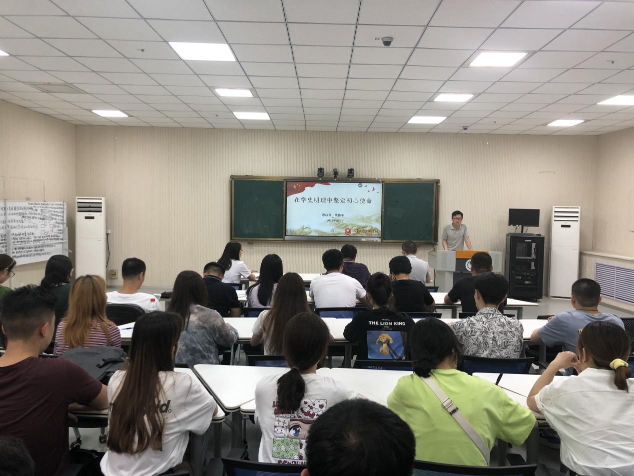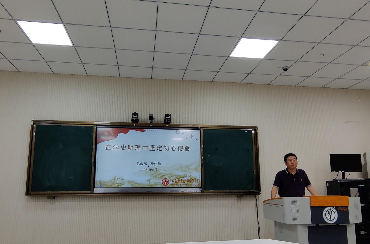 张东深首先介绍了学校党史宣讲活动的要求,对党史学习教育宣讲团成员、思想政治理论课教学部桑伟华老师进行了介绍;然后桑伟华老师以《在学史明理中坚定初心使命》为题进行宣讲,从“开天辟地,救国大业”、“改天换地,兴国大业”、“翻天覆地,富国大业”、“惊天动地,强国大业”四个方面,用事实和数据讲授了中国共产党践行初心使命的百年光辉历程,主题突出,脉络清晰;最后号召大家要坚守初心使命,赓续党的优良传统和作风,为实现中华民族的伟大复兴而不懈奋斗。