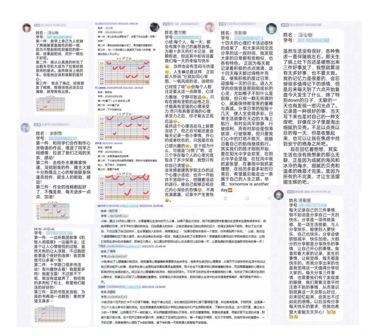 经过前期准备和宣传,“积极心理训练营”活动一经发起,得到了全校同学的热烈反响,活动群迅速爆满。5月17日活动开始后,同学们领取了训练营标志绿手环,佩戴至活动结束。活动过程中坚持每天在群里打卡,记录自己当天做的觉得最快乐或最有意义的三件事情,并写下自己在其中发挥的作用、收获的感受等;同时使用情绪卡片,通过观察周围发生的事情,体会自己当天体验到的积极情绪,并在彩色情绪图片上勾选当日积极情绪,完成打卡。此次活动自5月17日至5月31日历时14天,过程中同学们积极打卡、热烈讨论,分享积极情绪。活动结束后,很多同学都主动分享了自己参与此次活动的心得体会,氛围融洽、正能量满满。