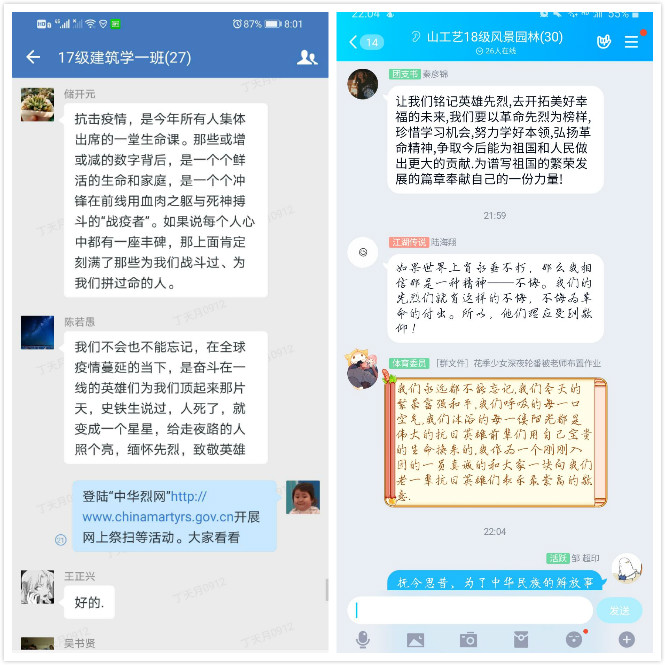 4月9日晚上,建筑与景观设计学院团总支组织开展了“缅怀英烈、致敬英雄”为主题的线上主题团日活动。各年级团支部通过企业微信APP、QQ班级群等线上平台,运用语音+文字的方式展开热烈的讨论。本次活动由各班团支部书记主持,全体共青团员积极参加。建筑与景观设计学院党总支副书记娄彦、辅导员陈铁、韩晓旭分别深入到各团支部指导主题团日活动。