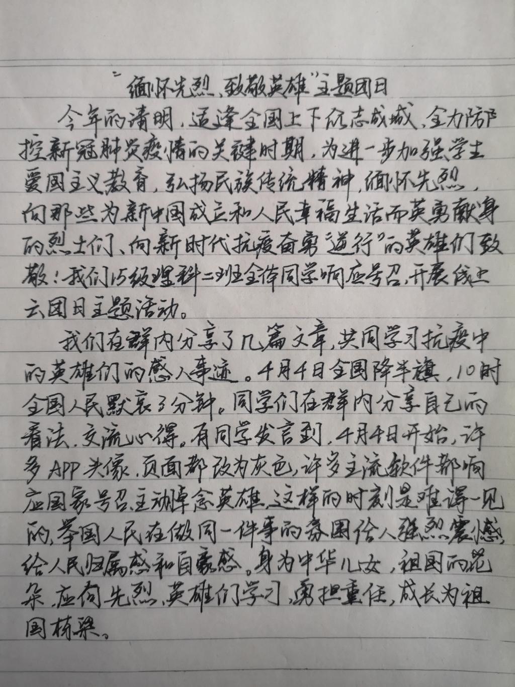 17级理科二班张亚琪:“清明时节雨纷纷,路上行人遇断魂。”每当我们读起这首诗句,就会情不自禁地想起为了革命事业而英勇献身的先烈,他们崇高的精神感染着一代又一代中国人。作为新时代的大学生,我们要继承先辈的意志,去完成他们未完成的事业,为了更好的明天而奋斗。