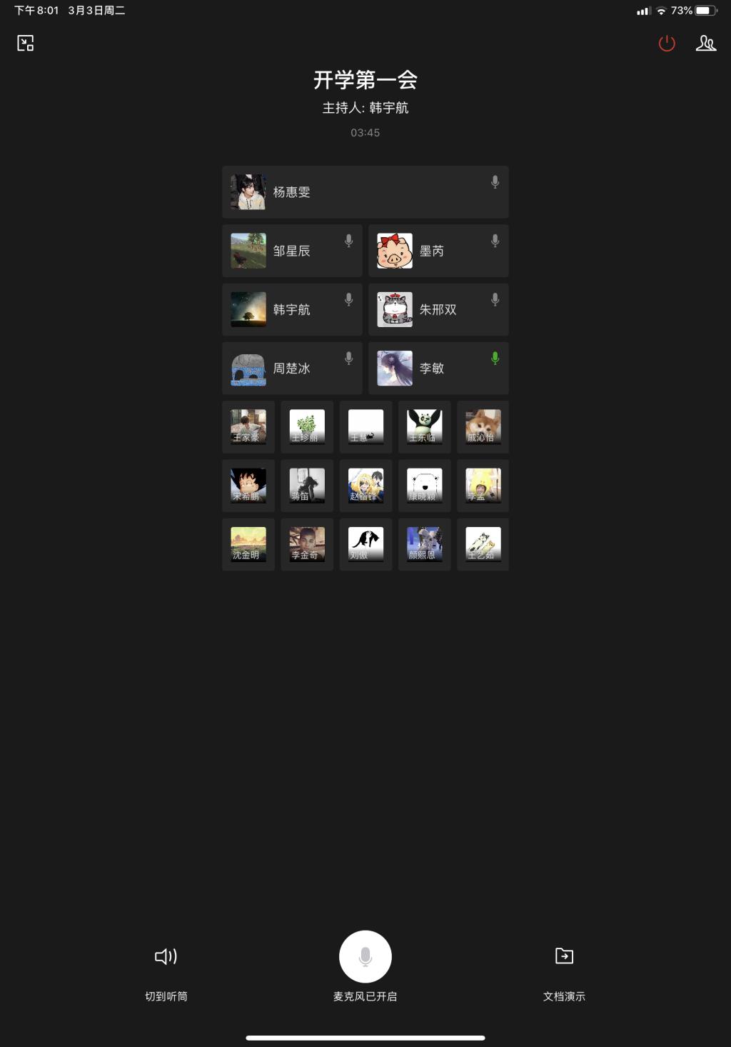 通过企业微信APP平台,各班主要学生干部参加了学生干部会议。晚上,娄彦、陈铁、韩晓旭参加了各班班会,对重点事项再次强调并与同学们进行交流。同学们纷纷表示会遵守纪律、服从学校安排;认为网上上课形式新颖,提高了学习兴趣,网络班会给同学们开辟了交流空间,拉进了同学之间、师生之间的距离;并对老师们的辛勤付出表示感谢。