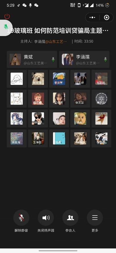 为增强同学们对“培训贷”陷阱的防范意识,现代手工艺术学院于2021年1月19日通过线上开展“防范‘培训贷’陷阱”主题教育。本次活动采取主题班会的形式,由各班班委主持,全体同学参与。