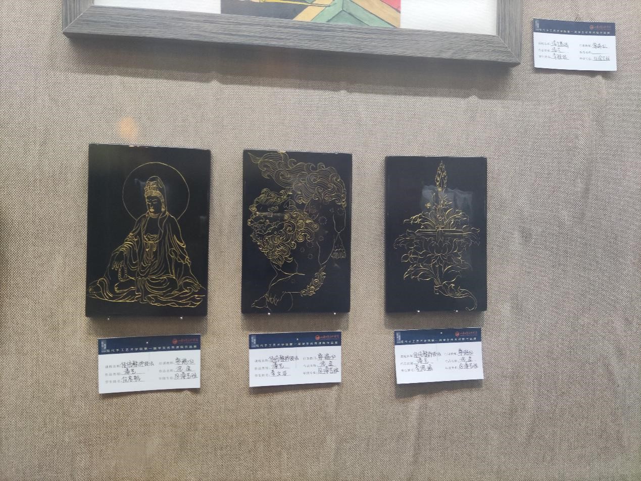 在《漆艺设计基础》这门课程中,展厅展出《沈金》等漆艺作品,在作品创意方面,鼓励学生大胆创新,采取多种题材进行多元化的表现,同学们借助专业课程的学习,提高了自己的创新能力,在不断的实践操作中,体会工艺美术的独特魅力。