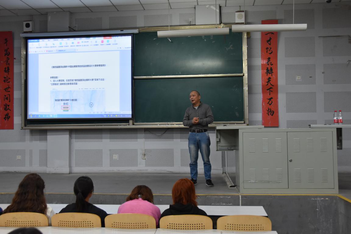 张毅教授首先播放了震泽古镇的宣传片。随后,展开了对丝绸的讲解与阐述,他讲解了本次"震泽丝绸杯"大赛的参赛指导,展示了历年参赛作品并对其中几幅作品进行详细的解说。张毅教授用产品设计与本次设计大赛的理念作比较,体现出设计大赛需要的是创新创意理念。接着,他根据作品内容及构思结合现代艺术进行了深刻的讲解,要求年轻人顺应当代艺术的四个要求,希望中国传统染织艺术能在我们这一代得到继承与创新,并能在当今多元化的世界里明确自己的位置,进而在新时代大放异彩。从历史看我们有底气,从时代看我们有机遇,从发展看我们有空间。要求国人进一步增强文化软实力和文化自信,从而进一步继承和发扬中华优秀传统文化。