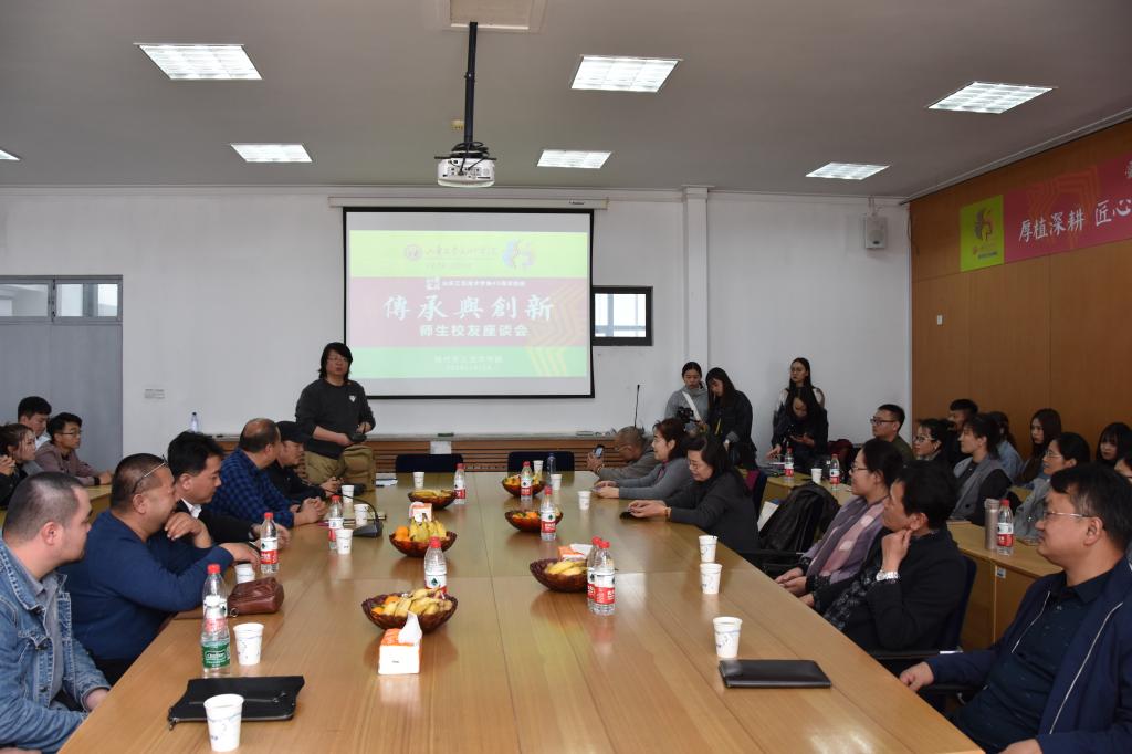 10月26日上午,现代手工艺术学院举办建校45周年校庆活动之“传承与创新”师生校友座谈会。济南校友会副会长、原山东工艺美术研究所所长王勇,山东华艺雕塑艺术股份有限公司董事长傅绍湘,青岛和力传媒集团CEO林剑刚,枣庄学院美术与艺术设计学院郭炜教授,86级校友、山东潍坊明奇纺织进出口公司总经理张传奇、84级校友青岛昱方林实业有限公司总经理杨发丛等校友以及学院院长赵进、党总支书记金伟、副院长宋处岭、副书记王国燕出席和学院教师代表参加座谈会。副院长宋处岭主持会议。