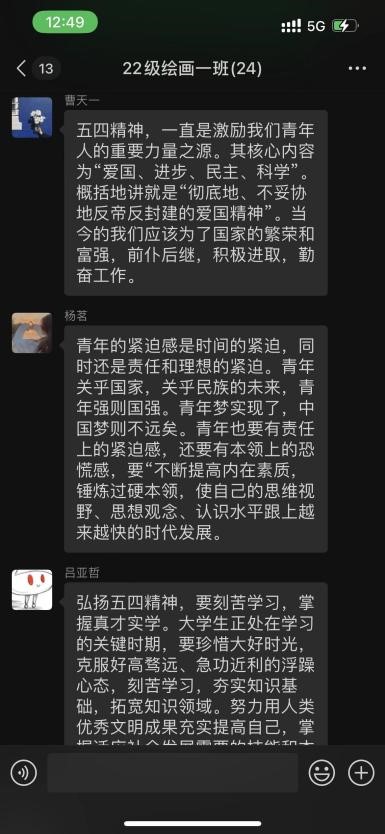 5月5日至6日,造型艺术学院各团支部通过主题班会、主题团日等多种形式开展习近平总书记的回信精神学习,鼓励全体同学积极参与学习活动,通过线上线下相结合的方式,交流思想与心得,深入了解建设农业强国战略部署,热议祖国未来、激发报国情怀,参加的团员青年都深受教育与启发。