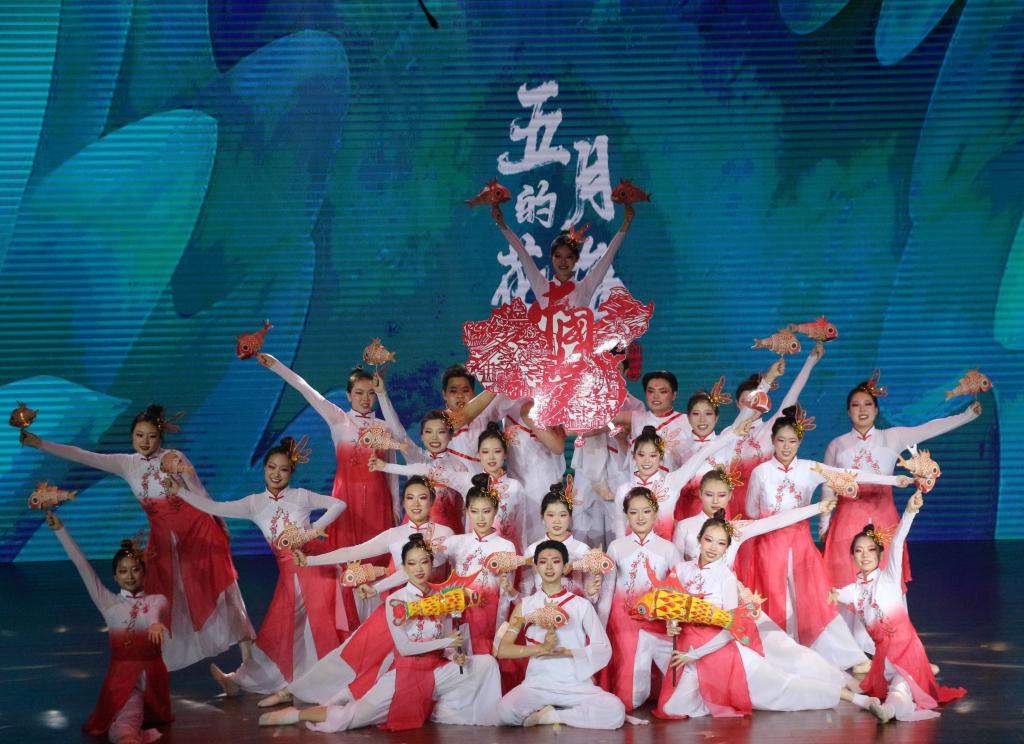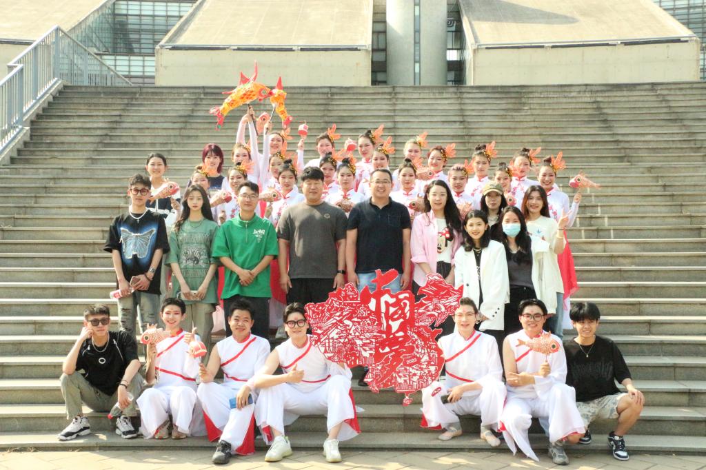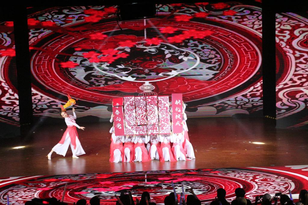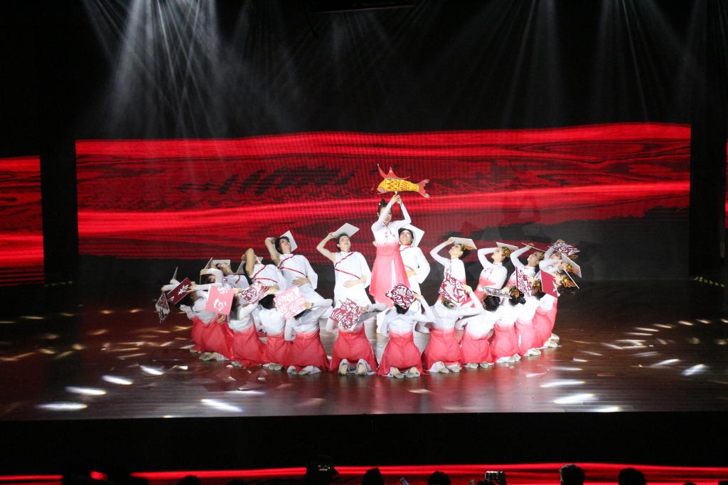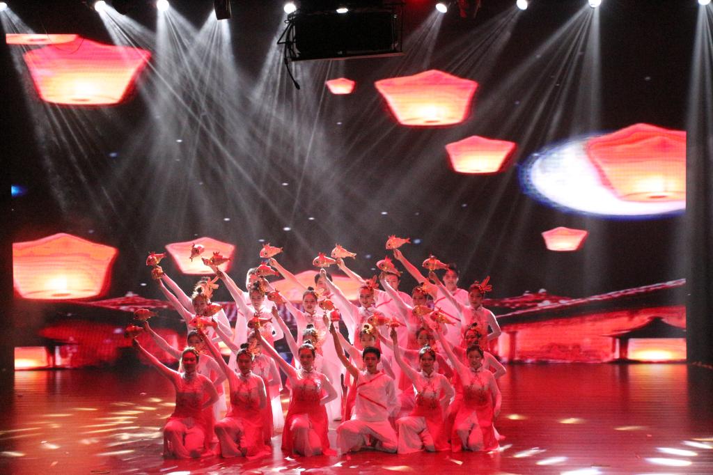 炫丽的光瀑开始倾泻,不同的形态转换,让舞台魅力四射。造型艺术学院代表队的同学们运用婉约精致的剪纸和栩栩如生的鱼灯,配上青春的歌舞,映花之盛景,在历史长河中绵延千年的传统文化焕发出新的生机。一纸点染,雕镂人间事,条篓成相,鱼灯映烛火,花海百汇山河,青春与舞同歌。造型艺术学院的参赛舞蹈《鱼灯妙影》,用精准细腻的表演将现场的评委观众带入到了民间艺术的场景中去,不仅体现出传统文化的独特魅力,也彰显出昂扬向上的精神样貌,具有独特的魅力。造型学子为现场师生们带来了一场精彩纷呈的舞蹈盛宴,美妙的演绎获得了观众们的阵阵掌声,叫好声亦此起彼伏。