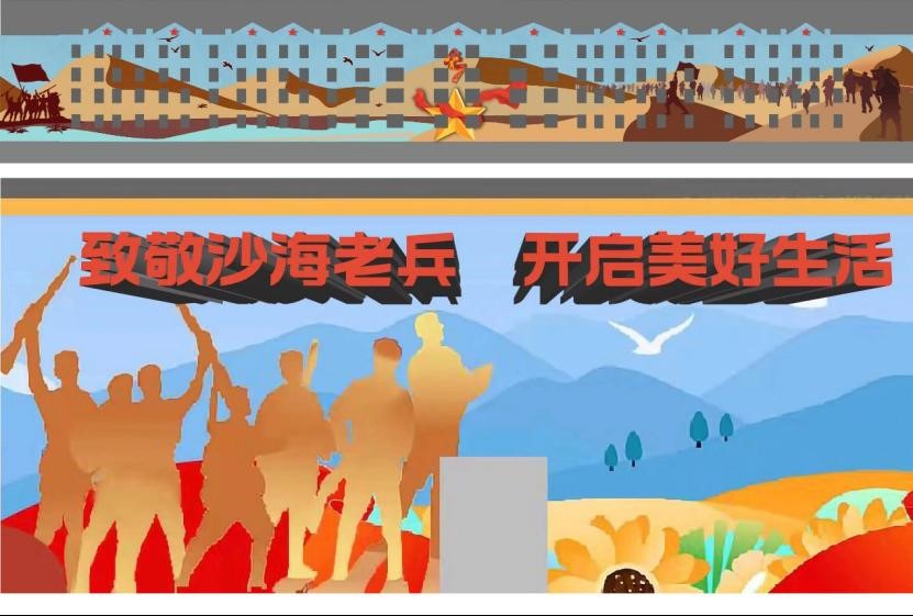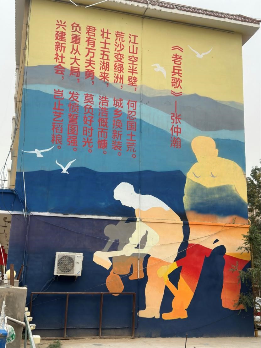 造型艺术学院党政高度重视,由壁画教研室主任齐敬峰、团总支书记许威治任指导教师,精心选拔学生骨干20余人,组建新疆生产建设兵团第十四师四十七团壁画社会服务队,开启了为期35天的沉浸式挖掘与创作活动。服务队在美育理念引领下,充分发挥学校专业特色和优势,以艺术实践的途径将思政内容融入其中,通过壁画形式传递“老兵精神”,在团场不同区域表达对革命先辈的敬意,直观感受思政教育的价值,同时推动“用艺术助力乡村振兴”,将老兵们的精神和英雄事迹多角度传播。