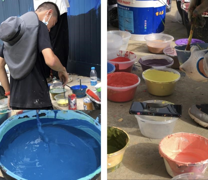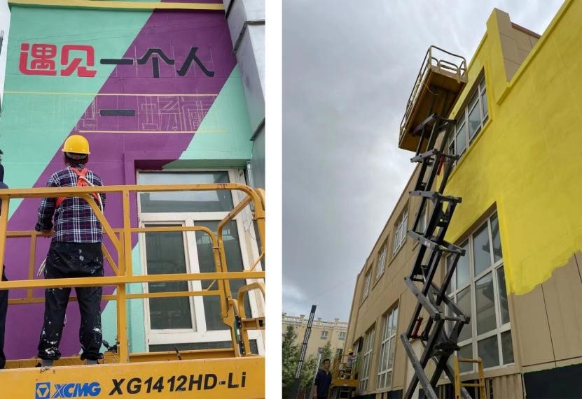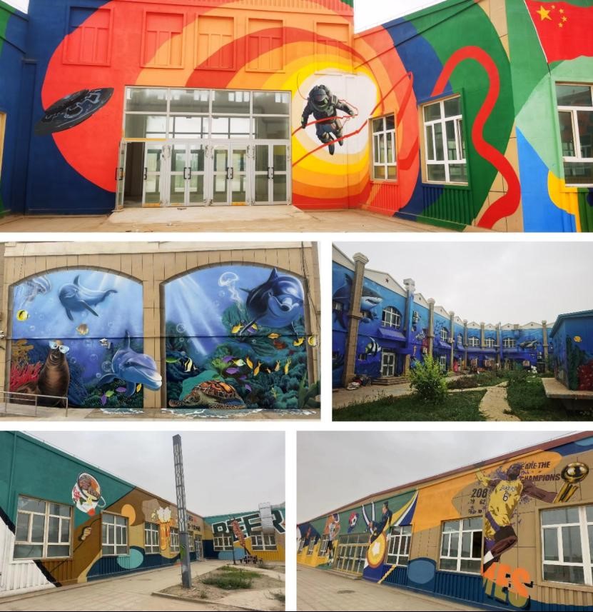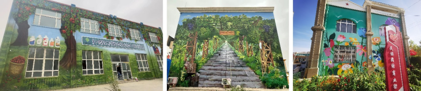本次活动的壁画绘制是面向整个四十七团团场,主要覆盖在沿街的主干道与重要节点上,涉及建筑类型众多,依据其使用功能、面积、位置,服务队做了详细精确的设计,制定出了一系列方案。