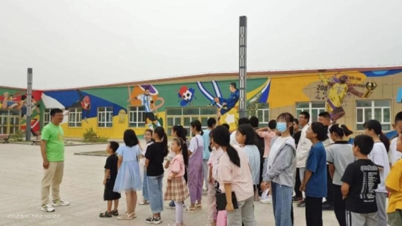 绘制期间,服务队联合第十四师民族团结红军学校开展“童心向未来 丹青颂华章”主题壁画参观实践活动。齐敬峰带领小朋友们参观了服务队的工作成果,并引导其亲身体验作画过程。服务队的“青春记忆”、“海洋馆”、“美好生活”等主题墙绘,涵盖了老兵精神、航天工程、体育音乐等丰富内容,使墙壁成为切实有效的社会课堂,成功地为小朋友们上了一堂别开生面的实践课。