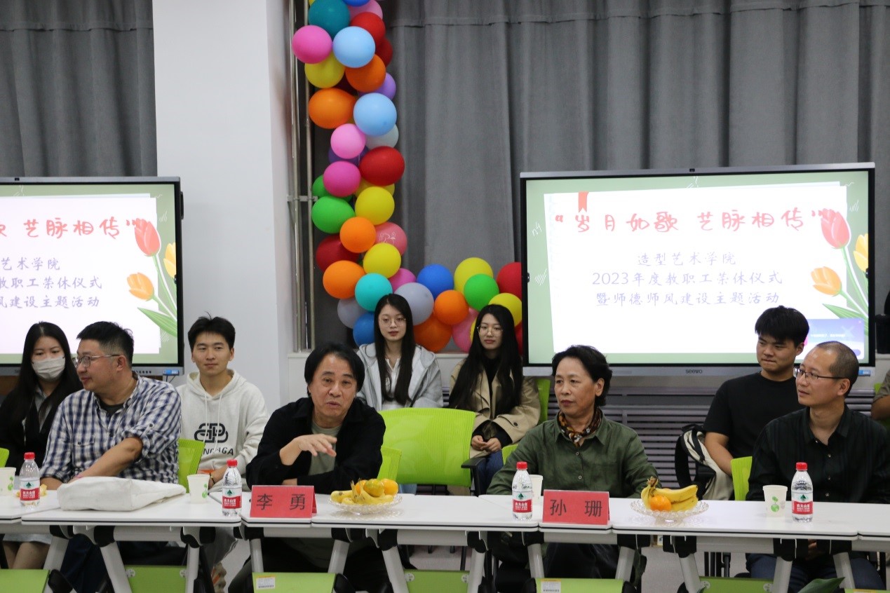 2023年,造型艺术学院共有李勇、孙珊两位教授荣休。孙大刚代表学校对二位老教师为学院发展辛勤的付出及做出的贡献给予高度评价和衷心感谢。他谈到,荣休的老教师是学校、学院教育事业发展的建设者和开拓者,他们在教学岗位上,数十年如一日,为学院的发展倾尽全部心血,为学院的教育事业奉献了汗水和智慧,培养了一批批优秀艺术人才,年轻教师要接过老一辈手中的接力棒,传承和发扬好他们的优良传统,为学院作出自己应有的贡献。在学校和学院面临高质量发展的关键时刻,青年教师和全体教职工要以老教师为榜样,冲在前、干在前,谋事业、求发展。