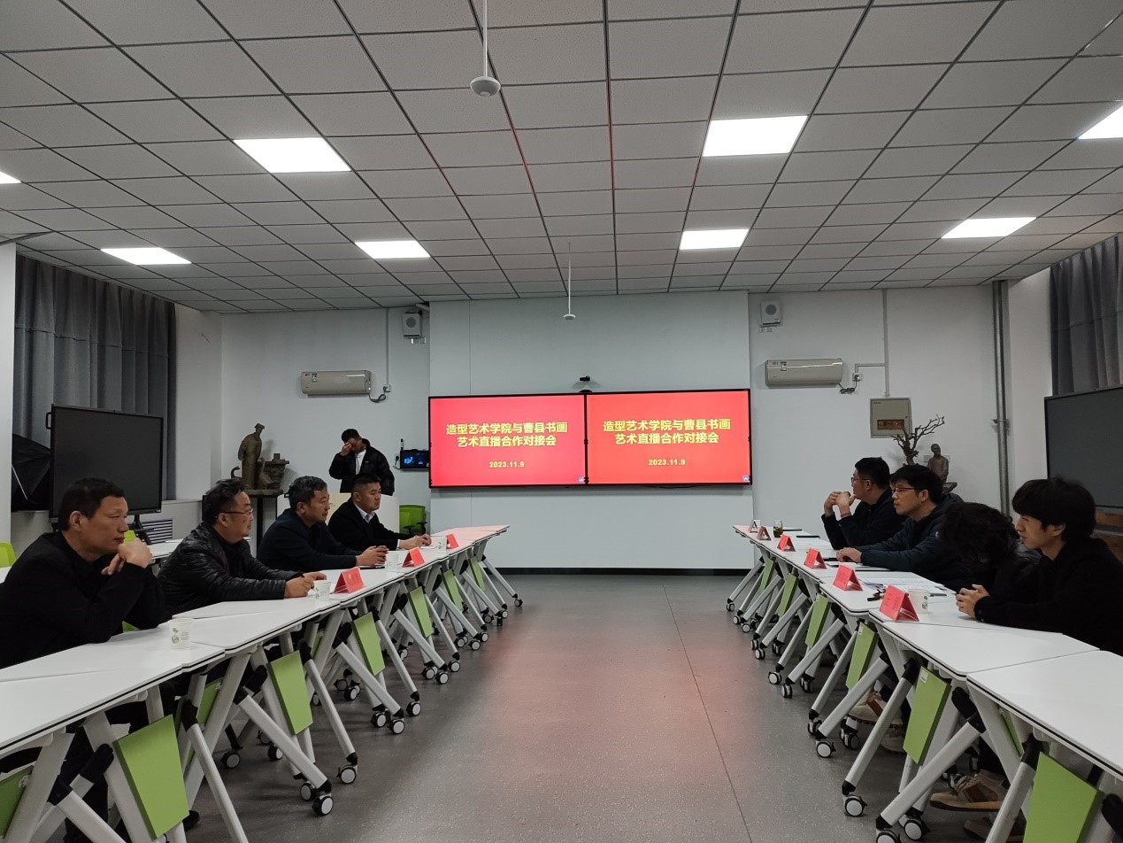 2023年11月10日,曹县文化和旅游局党组书记、局长孔繁星等一行人员来我院进行书画艺术直播合作相关事宜对接洽谈。造型艺术学院党总支书记李希进、中国画教研室、书法教研室和办公室相关人员参加接待对接会。