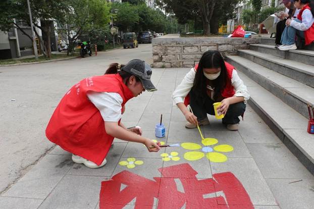 5月28日,阳光和煦,微风拂面。为弘扬"奉献、友爱、互助、进步"的志愿服务精神,充分发挥艺术专业服务社区建设的优势,造型艺术学院组织学生党员、入党积极分子及学生干部为主体的志愿服务队,赴紫薇阁社区开展"绘地生姿暖社区"主题墙绘活动。通过创意地面涂鸦艺术,志愿者们为社区环境增添亮色,传递文明新风。
