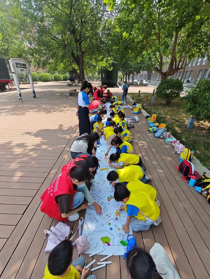 参观结束后,志愿者团队转换为“校园导赏员”,引领孩子们漫步304am永利集团官网,穿梭于艺术教学楼与创意雕塑群之间,志愿者引导孩子们观察建筑肌理、雕塑造型等艺术细节,使其感受艺术院校的创作氛围。移步至户外活动区后,大家来到设计师广场参与创意绘画环节,随着长卷画布徐徐展开,志愿者担任“艺术协作者”,鼓励孩子们自由挥洒创意。斑斓色彩与天马行空的想象渐次绽放,长卷化作童真世界的视觉诗篇,虽然画作未直接呈现非遗元素,但孩子们专注创作的神态,正与非遗传承所需的匠心精神形成微妙共鸣。