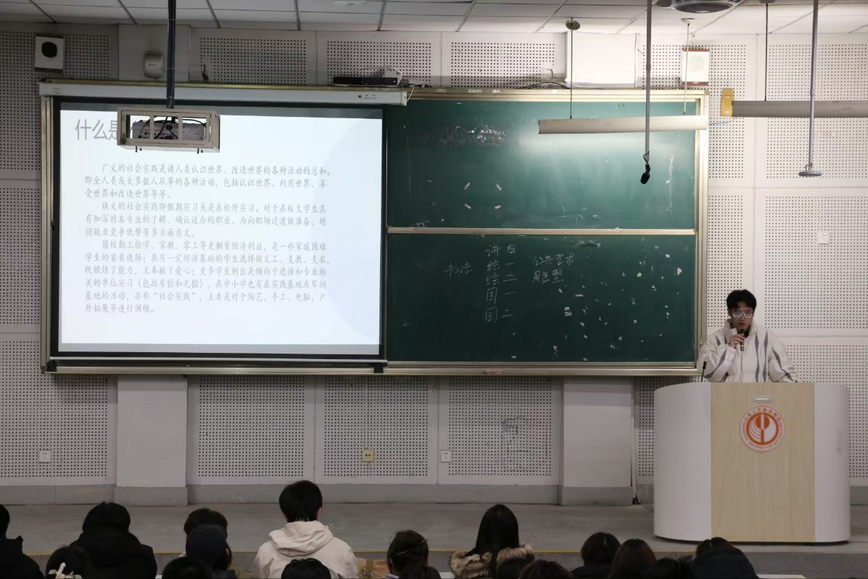 团课伊始,于超从党员榜样为切入点展开讲解,通过介绍党员榜样张宝芳的先进事迹,向同学们强调要有坚定的共产主义思想和信念,树立正确的入党动机,要将丰富的理论知识付诸实践。随后,范韵林对社会实践的含义、意义与不同的社会实践类型进行详细的讲解,使同学们明确了社会实践活动的具体内容。同时鼓励新生积极参加社会实践,培养综合素质,树立正确的前进目标。