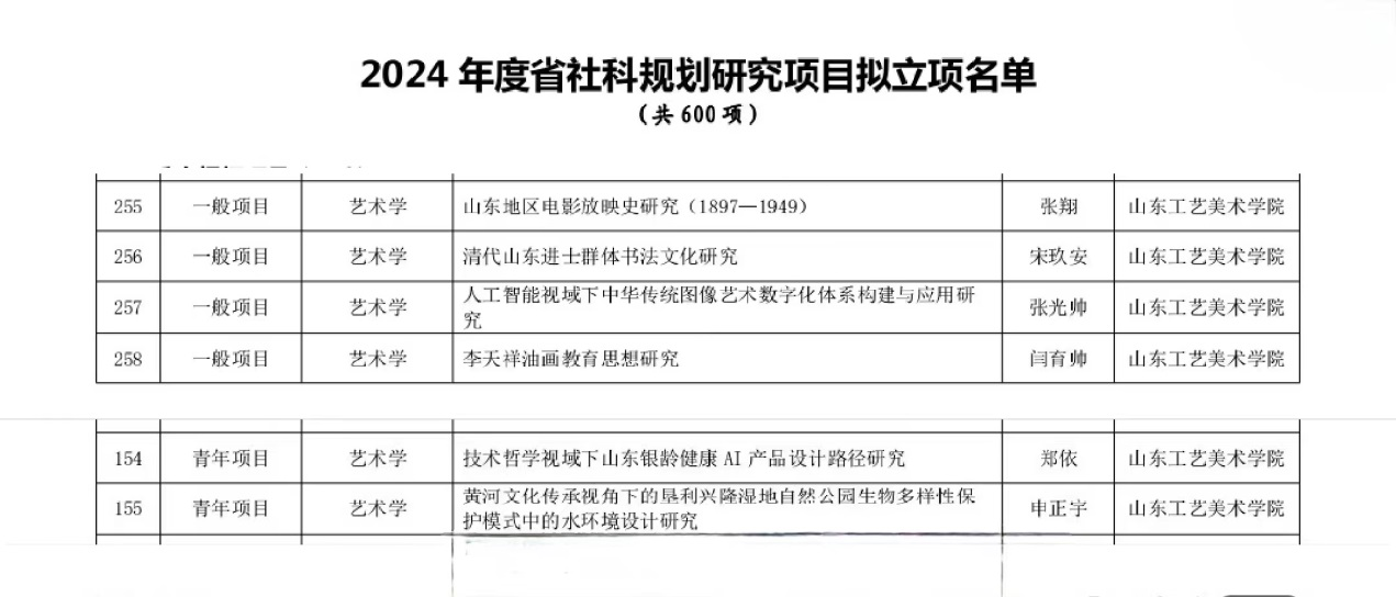 近日,2024年度山东省社科规划研究项目经过通讯初评、会议评审,共评选出拟立项项目600项并将拟立项项目名单予以公示。我院宋玖安申报的《清代山东进士群体书法文化研究》、闫育帅申报的《李天祥油画教育思想研究》获批一般项目。