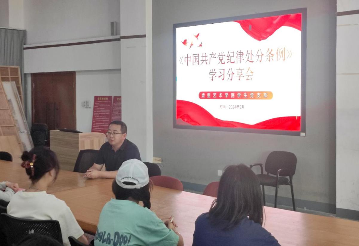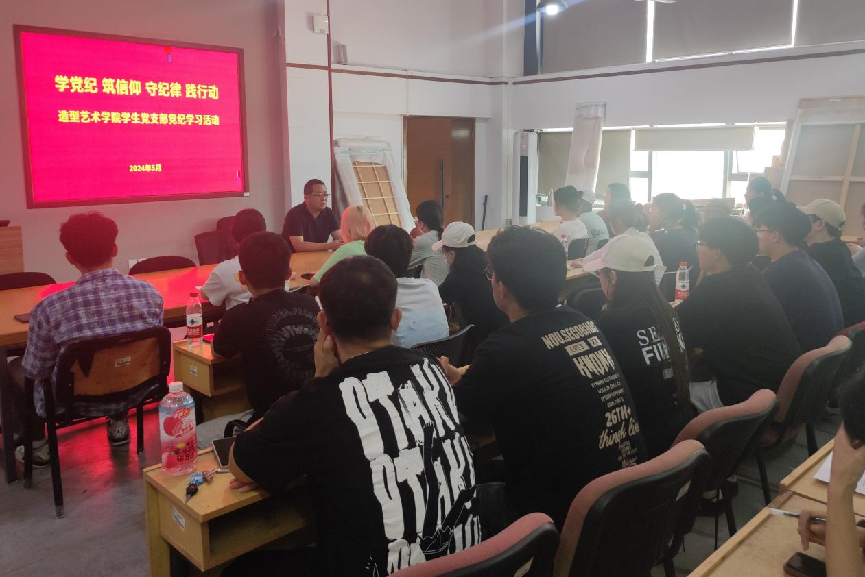 自党纪学习教育开展以来,造型艺术学院学生党支部把开展党纪学习教育作为重要政治任务,紧密结合实际,丰富学习形式,努力使党纪学习教育内化于心、外化于行,组织开展“学党纪筑信仰守纪律践行动”党纪学习教育。系列活动由学生党支部书记许威治主持,辅导员朱员、谢军及全体学生党员、入党积极分子参加。