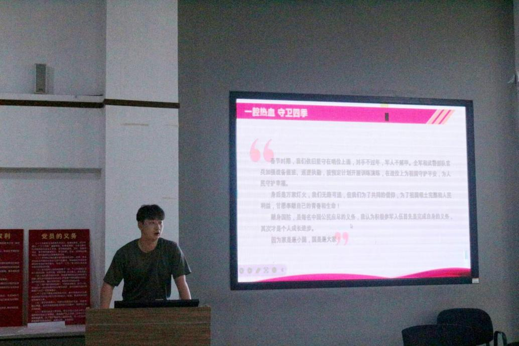 会议伊始,任佳文分享了自己的入伍契机和部队经历,向同学们展示他在部队的各项任务,从当前最新入伍政策、入伍优待、兵役登记以及调整身体状态四个方面进行了系统化的讲解。入伍经历不仅丰富了他的人生阅历,增强了体魄,更获得了心态与思想方面的显著成长。