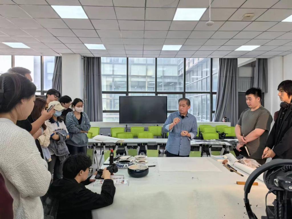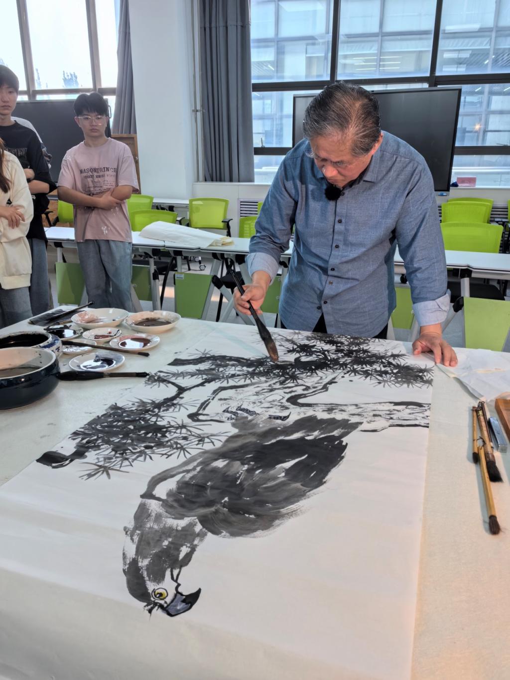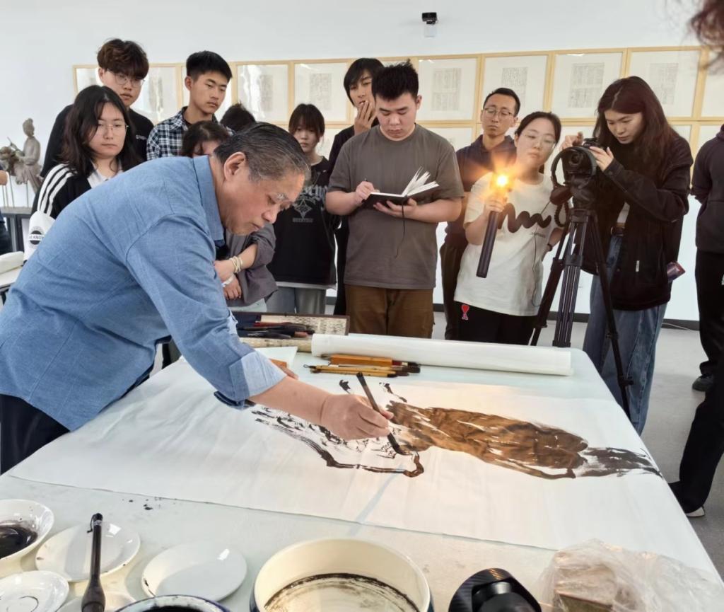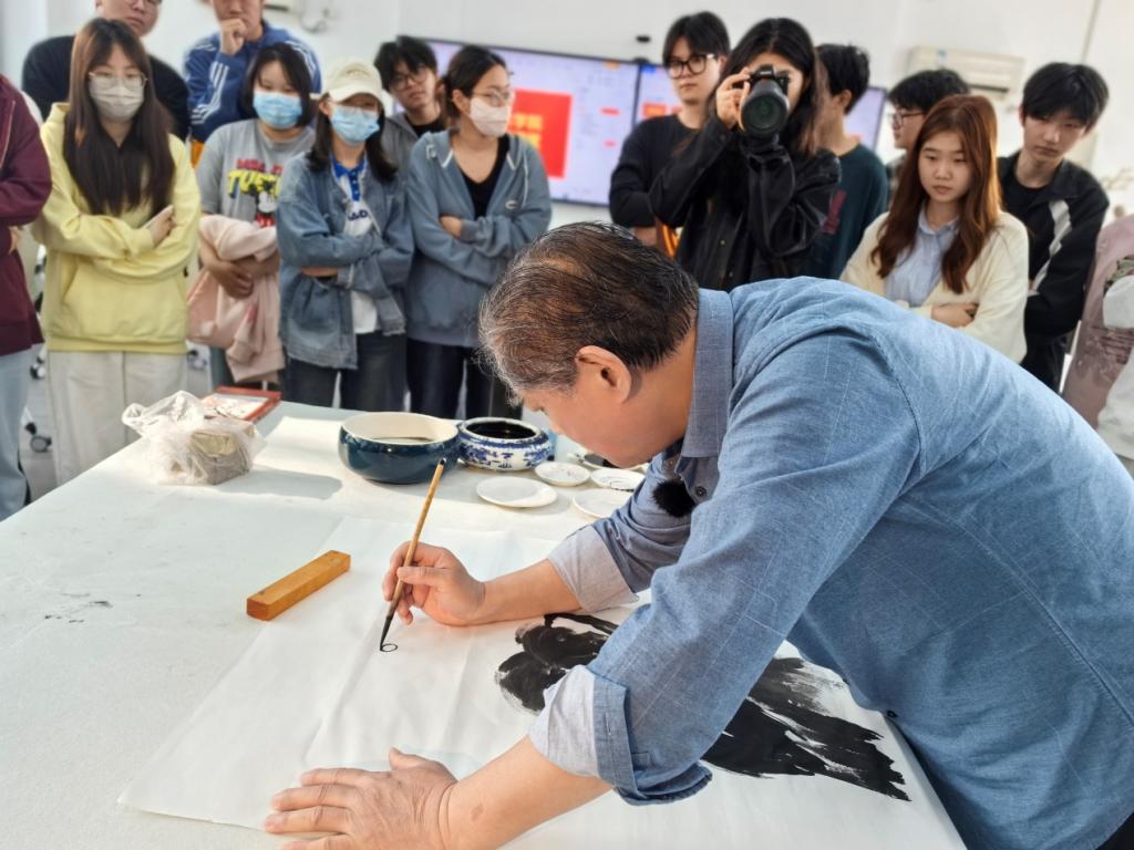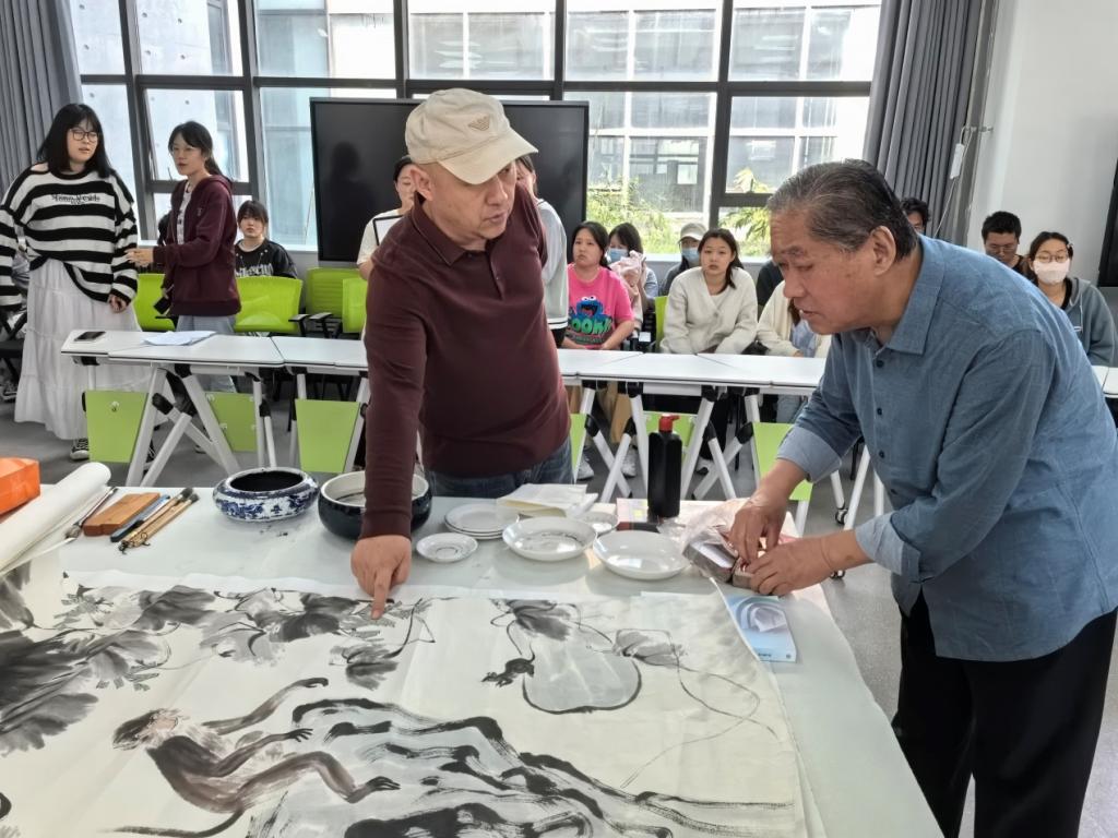 为了更为直觉的让师生体会理解创作的过程和技法,李龙潭教授现场示范创作大写意作品一副,现场师生认真观看并记录示范过程。创作结束后师生与李龙潭教授交流观看心得,并沟通学习创作过程中所遇到的困难和问题。