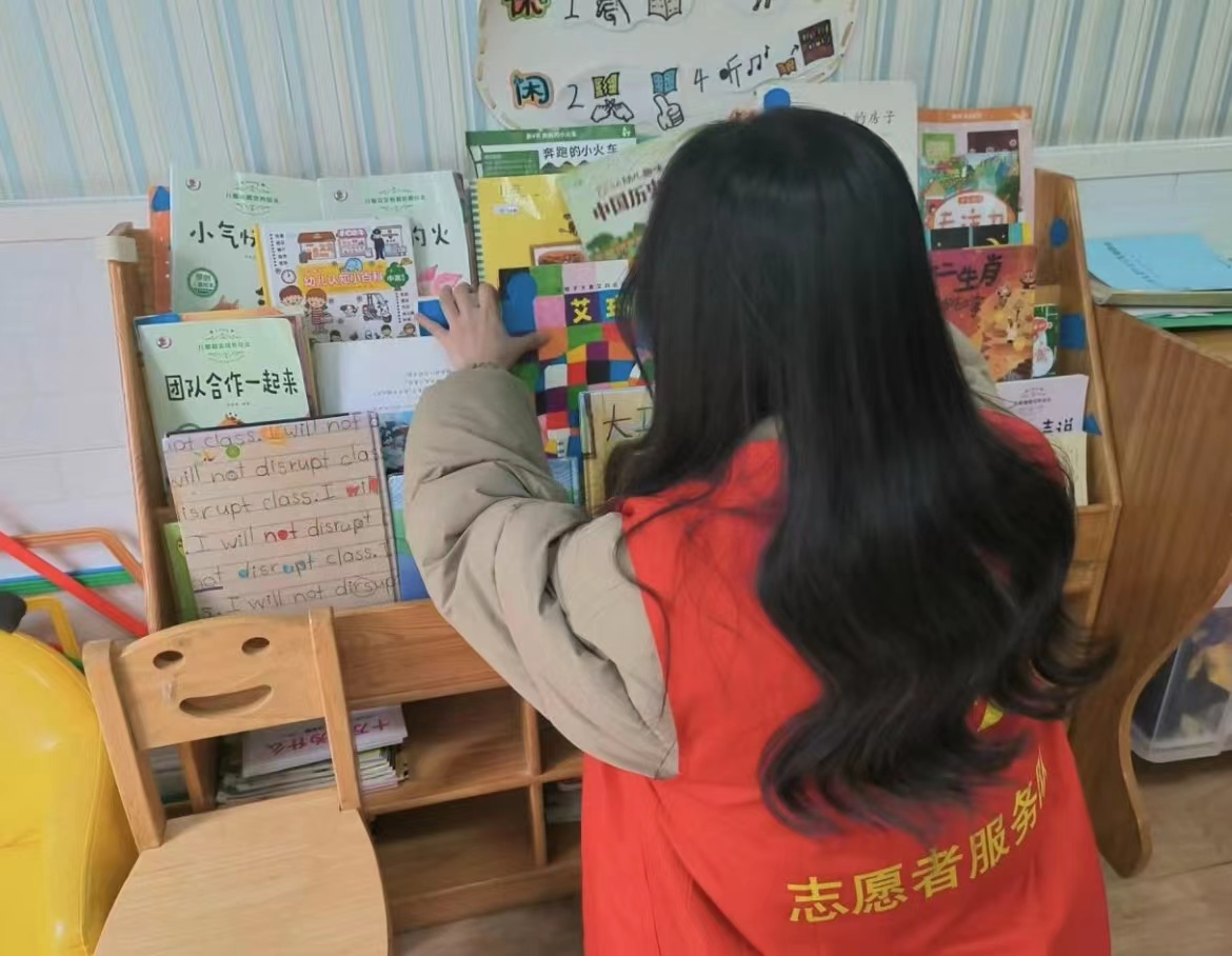 (图为王忆柠在培训机构整理图书)