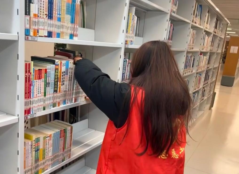 (图为高宇涵在整理图书馆藏书)