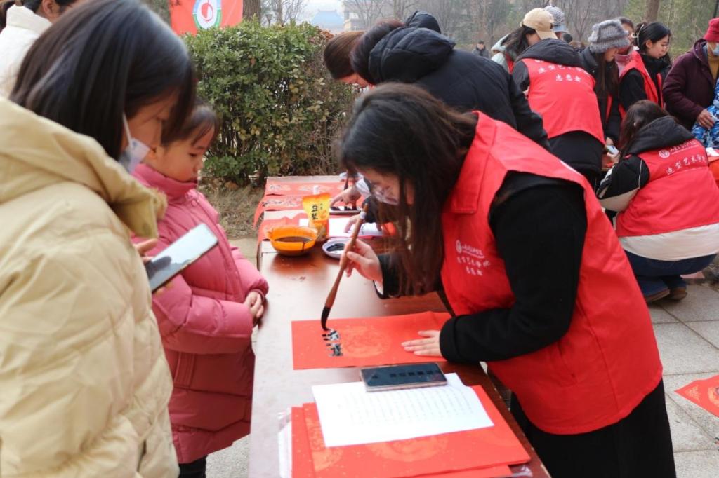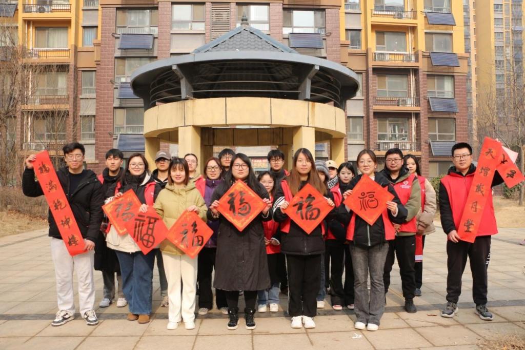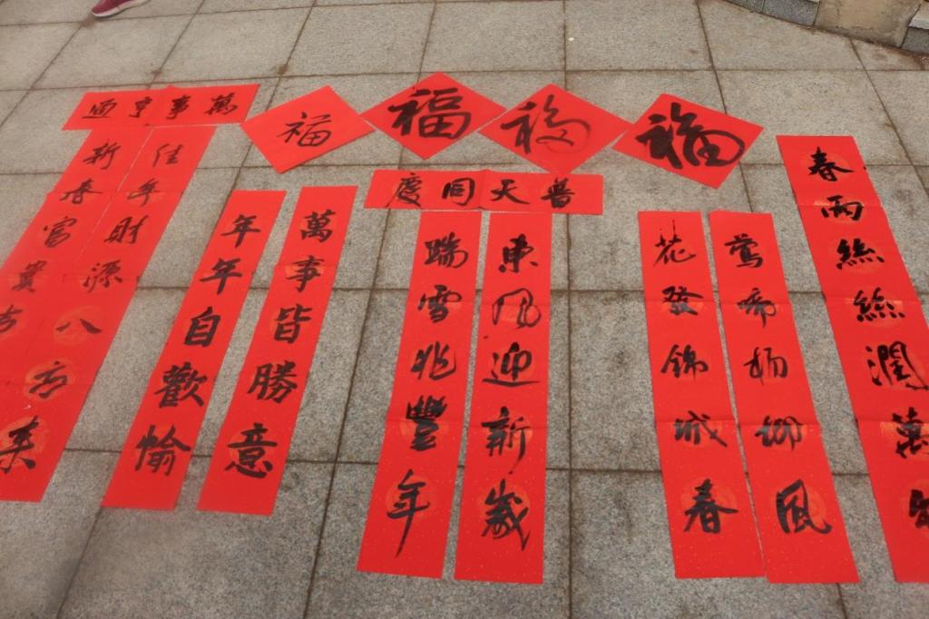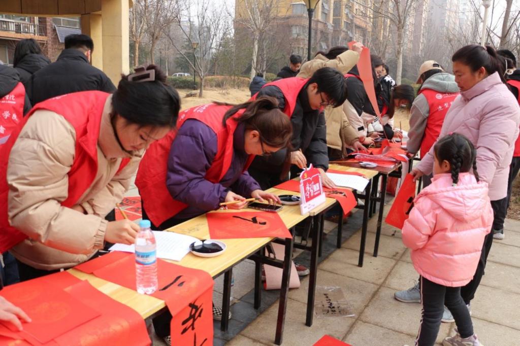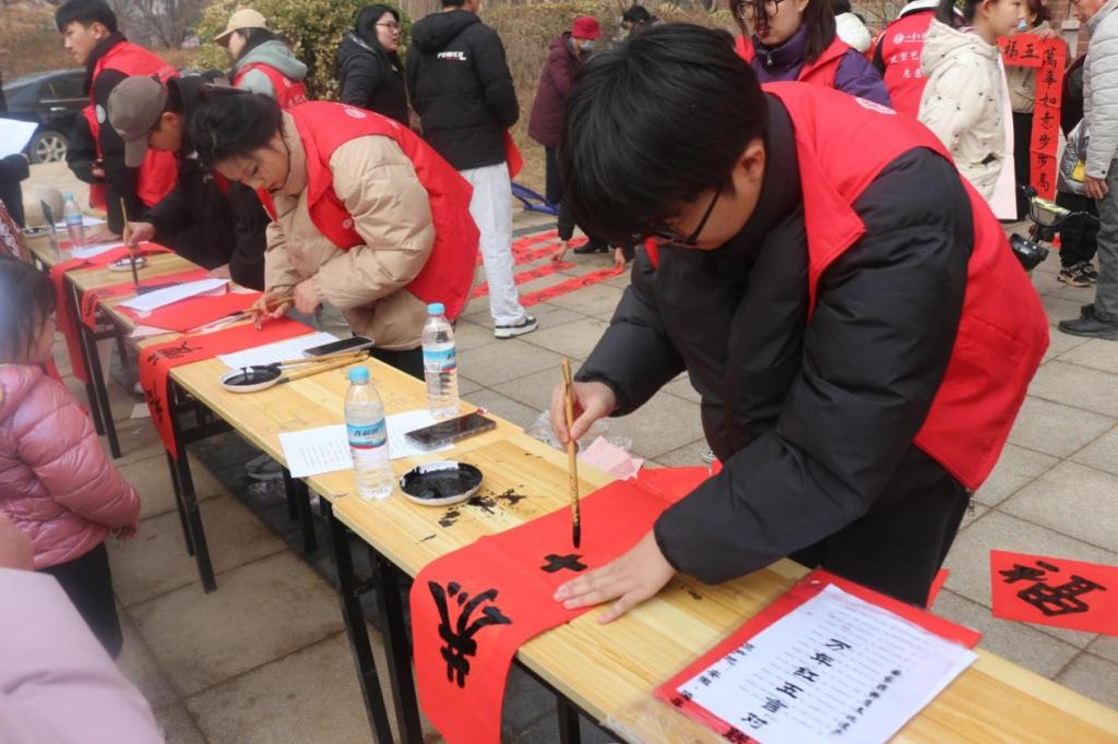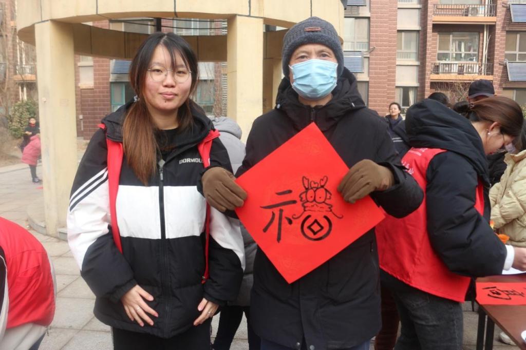 活动现场暖意浓浓。学院志愿者充分发挥书法专业特色,墨香四溢,一行行俊逸的书法,一句句真诚的祝福,一幅幅精美的“福”字,寄托了同学们辞旧迎新、祈福纳祥的美好愿望,为即将来临的春节增添了浓浓的喜庆氛围。期间,志愿者们将写好的对联分发给社区居民。红色的对联纸上,流淌着浓郁的中华文化,传递着对新年的美好祝愿。居民们手里捧着刚刚领到的春联和福字,精神愉悦,情绪高涨。他们纷纷表示,此次活动不仅弘扬了中华优秀传统文化,渲染了节日氛围,也方便了百姓日常生活,希望以后可以多举办此类活动。
