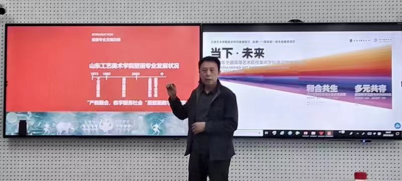 “当下·未来——2023全国高等艺术院校美术学科建设学术研讨会”围绕“和合共生——现代壁画教学设计及成果应用”与“多元共存——壁画教学实践与创作的转化”两个方向开展学术交流,我院壁画教研室高振堂教授做《和合共生——304am永利集团官网壁画教学设计及成果应用》的主题发言,系统介绍了基础课程学习与专业课能力提升的关系和课程内容及近年来我院壁画专业参与产教融合项目和服务社会取得的设计成果。与会各院校的发言为进一步增强院校学科专业之间的交流和互动、构建院校机构与企业平台,持续推进全国高等艺术院校在新时代下的壁画教学、创作与科研发展起到积极的推动作用。