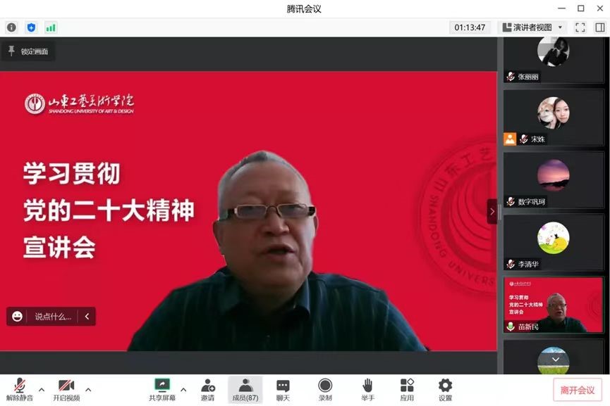 为切实做好党的二十大精神学习宣传贯彻工作,落实学校《中共山东工艺美术委员会关于深入学习宣传贯彻党的二十大精神实施方案》工作安排,推动党的二十大精神落地落实,形成学思践悟、实干笃行的良好氛围,1月9日上午,学校党委委员、纪委书记、监察专员苗新民为造型艺术学院全体教师作党的二十大精神主题宣讲,造型艺术学院党政领导班子成员、全体教职工以线上形式参加会议。