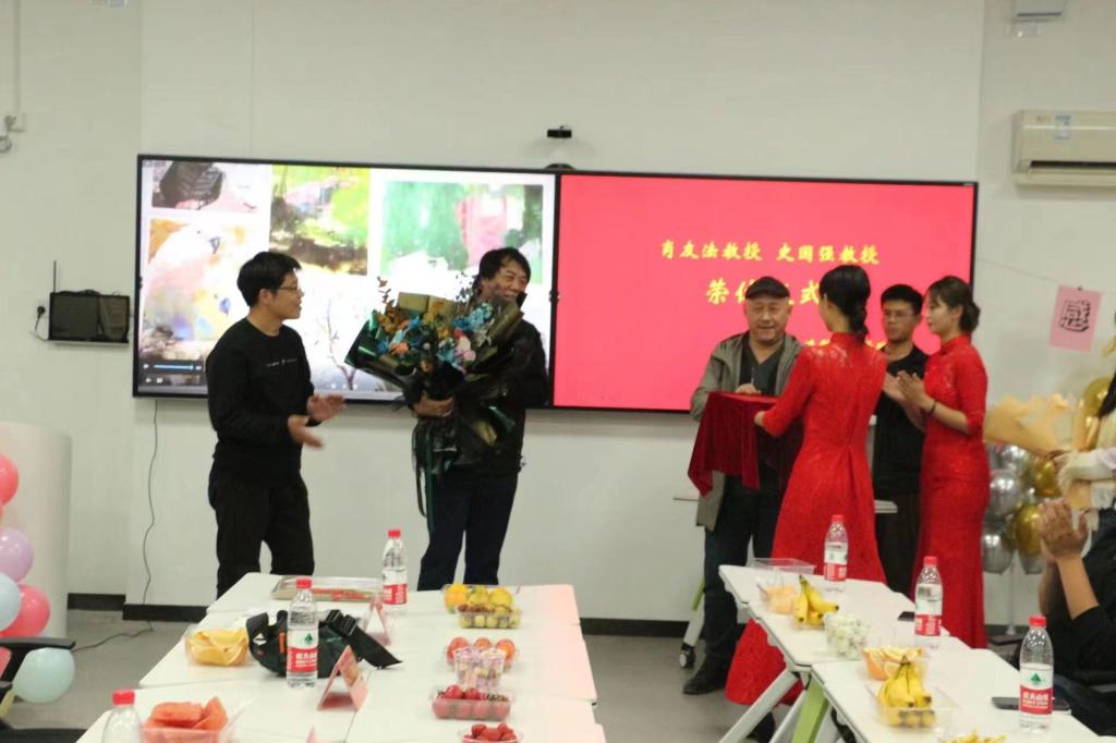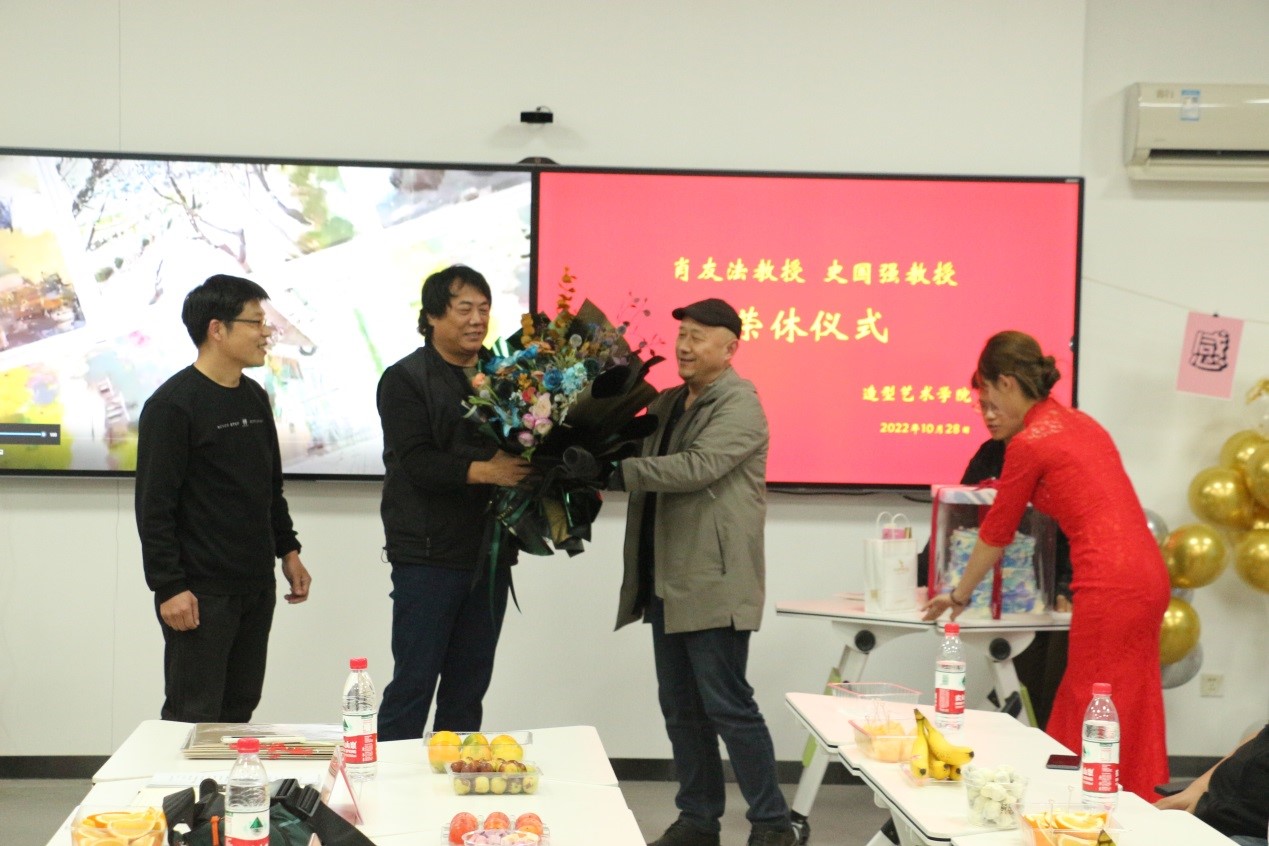 2022年,造型艺术学院共有肖友法教授、史国强教授两位教师荣休。荣休仪式上刘宁院长首先代表学院对两位老教授为学院发展辛勤的付出及做出的贡献给予高度评价和衷心感谢。指出,老教师将自己的美好年华奉献给了学院,把立德树人作为毕生的事业,这种无私奉献,学高为师、身正为范的精神,对学院发展建设起到榜样示范引领作用,需要代际传承、发扬光大。荣休仪式学院是第一次举行,很有意义,将作为学院文化的一部分,以后还将延续下去,每一位荣休老教授都是学院宝贵的财富,希望老教授们“退而不休”继续关心支持学院的发展,“常回家看看”。