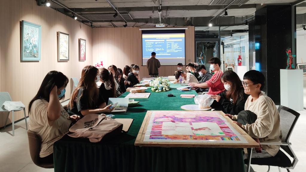 此次课程围绕壁画创作进行教学,以传统文化、庆祝建党一百周年、学校校庆50周年、民俗文化等题材为主题,以掐丝珐琅等技法为材料进行艺术创作。潘鲁生指出,要深入研究中华优秀传统文化,借助传统手工艺技法进行教学探索,可适当增加多种工艺技法从而丰富壁画艺术表现形式,从而做到创造性转化和创新性发展。