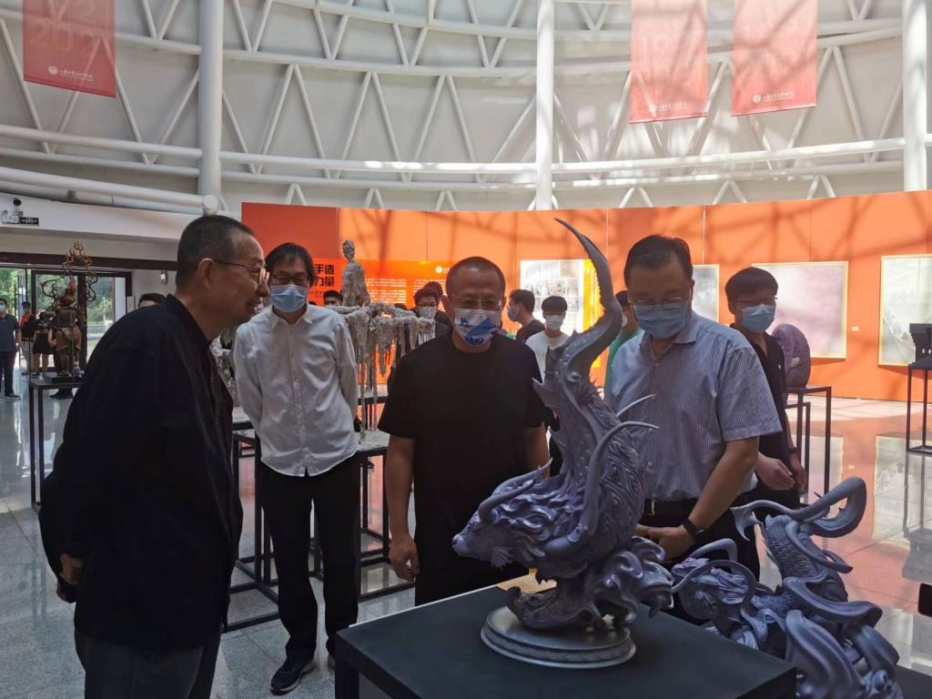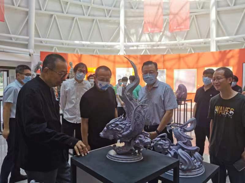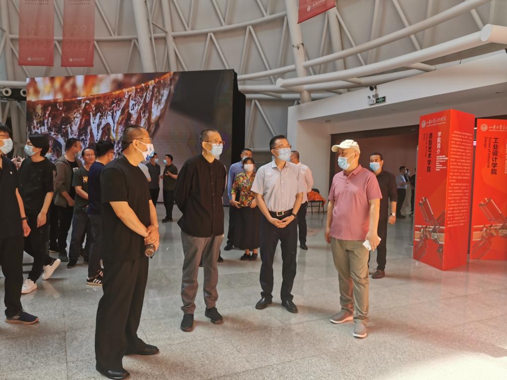 展览展出造型艺术学院2022年毕业学生的118幅(组)毕业作品,涵盖中国画、油画、壁画、书法、雕塑、公共艺术六个专业方向。潘鲁生对造型艺术学院今年的毕业作品表示了肯定,并对部分专业的优秀作品现场做了点评。他指出,在以后的教学与创作中,学院要遵循“传统造物”的创作理念,注意传统文化的深入挖掘以及传统题材的现代性转化,在以后创作中要注意参展作品题材与体裁的多样化区分与丰富性拓展。要求教师在指导创作时要有针对性地对学生在这些方面进行有意识引导。对于雕塑与公共艺术专业的部分可能实现成果产出的作品,要在创作之初,在实现作品艺术性的同时,注意作品表现题材、创作体裁与消费群体的社会化调研与需求定位研判,充分发挥专业优势,深入挖掘中华优秀传统文化资源转化为当代艺术的再生能力,活化中华优秀传统文化融入当代生活空间、引领消费的撬动作用。并通过展览,搭建学校与社会持续沟通的桥梁。