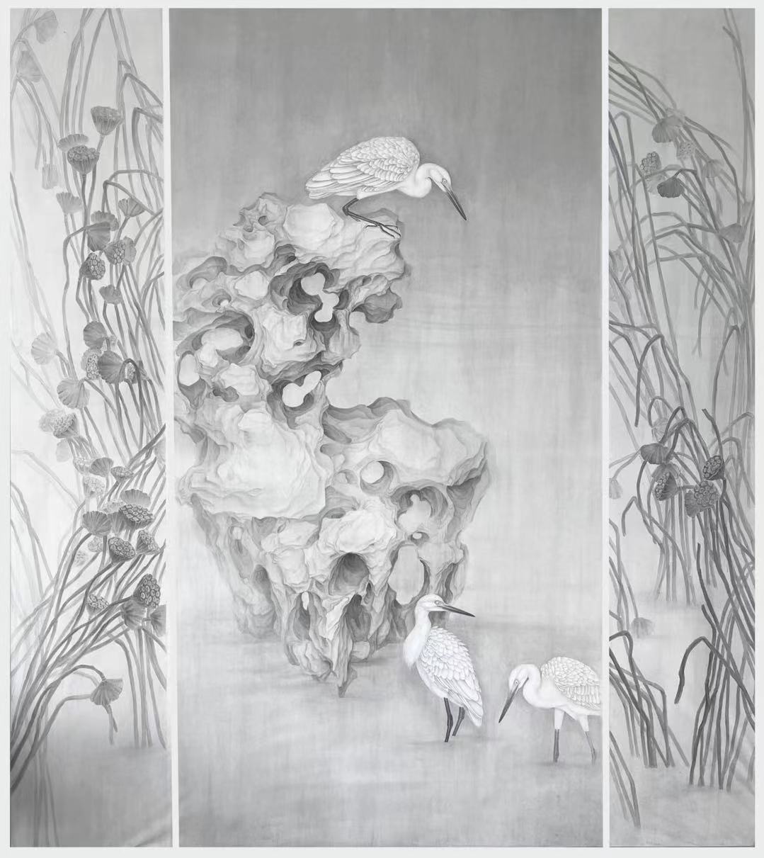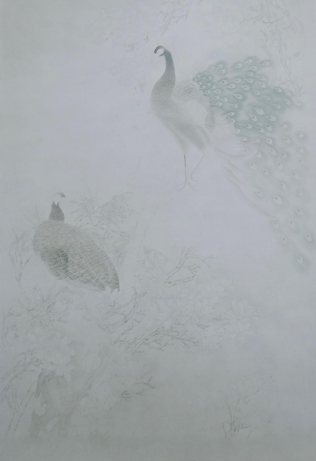 作品介绍:孔雀是一种十分美艳的禽鸟,但在这次创作中我以墨色晕染稍加设计这样较为朴素的形式予以表现,为的是表达一种返璞归真的意境,低调谦逊是美德,就好像柔和温吞而又洁净的白玉兰,正直坚韧的竹一般。“谦谦君子,温润如玉,如切如磋,如琢如磨。”