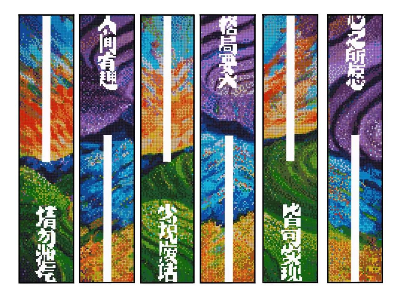作品简介:四季初始,春到人间,草木皆知,本幅作品运用玻璃马赛克描绘梯田,用拼贴交错的对比色增加画面感染力,视觉中心的文字表述了在正青春的年纪应有的人生态度,山有顶峰,湖有彼岸,一切皆有回甘。