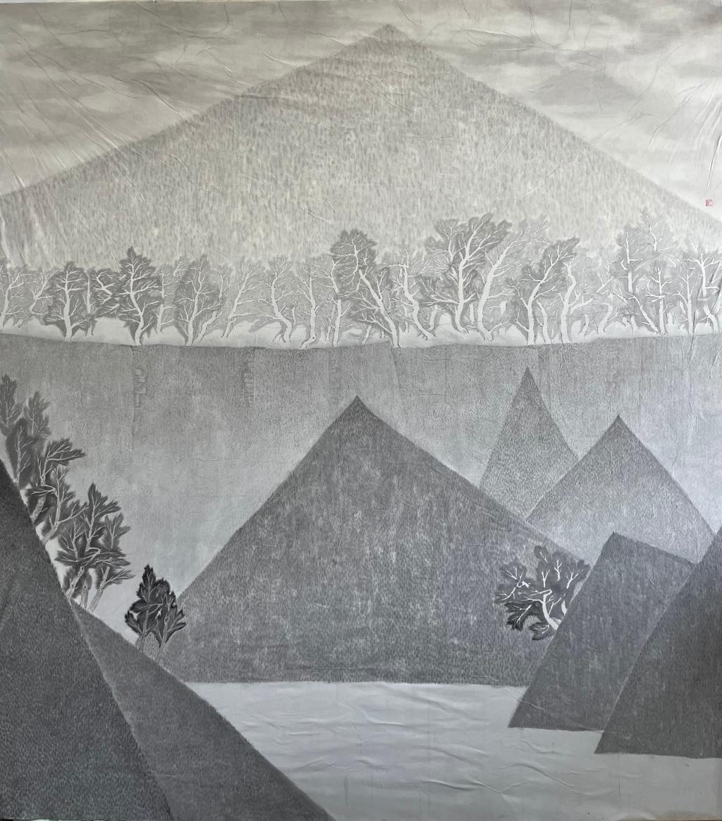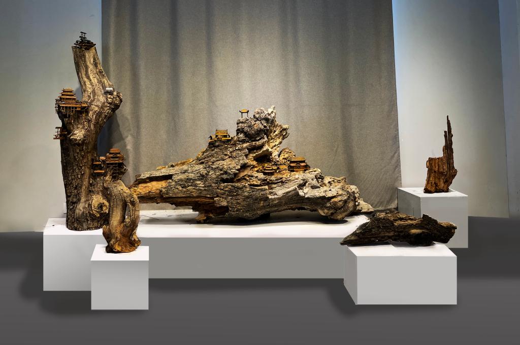 作品简介:从中国传统艺术中汲取的元素,与当代的雕塑语言相结合,运用中国绘画的构图、意境、形式,用现代雕塑材料表现进行创作。作品以中国山水画中的建筑造型为原型,运用现代的金属焊接技术,运用铁木相融的方法,展现中国的山川地貌,以朽木的自然形式,展现出巍峨的山峦,更能直观地反映出山水的意境。