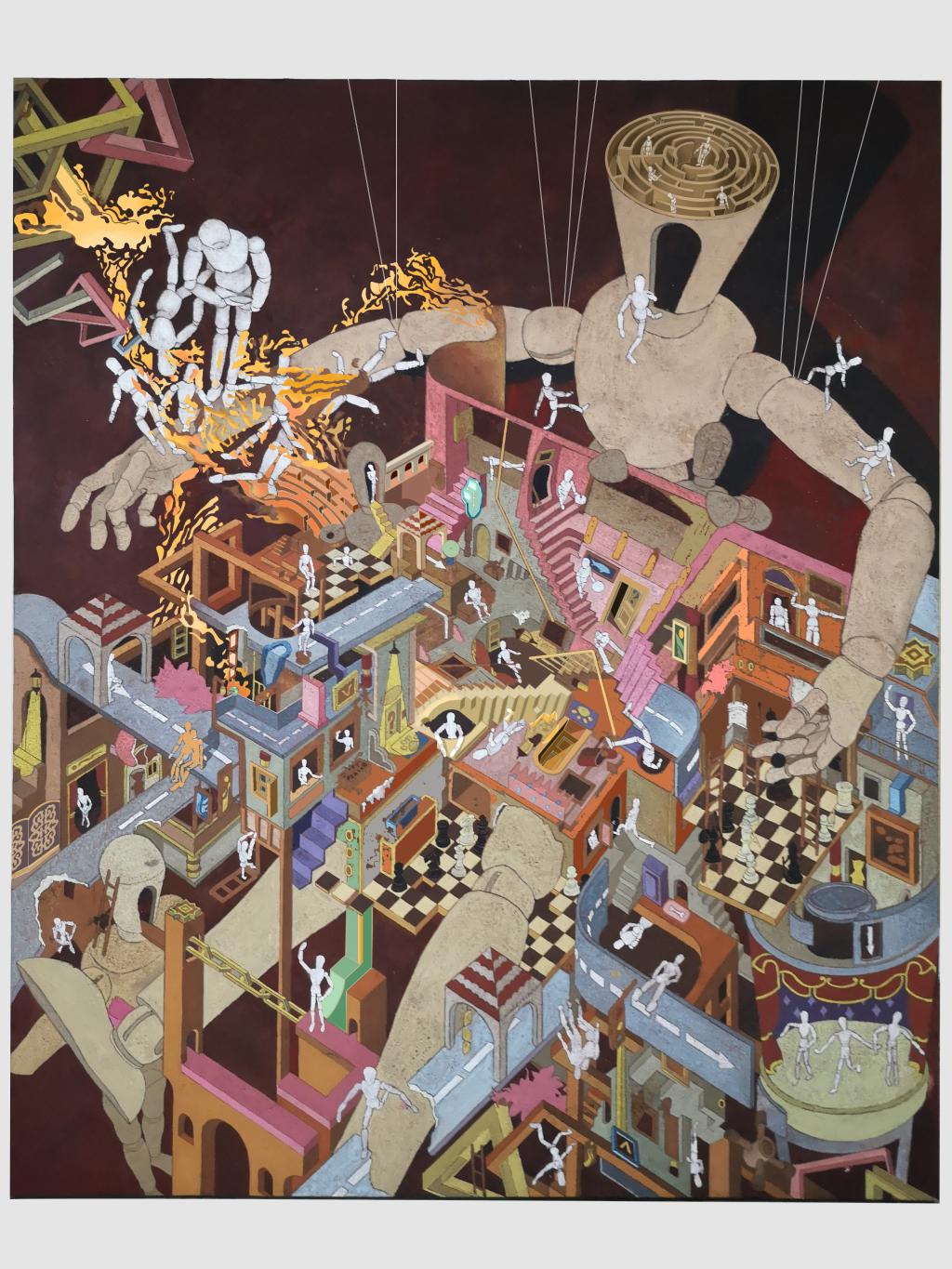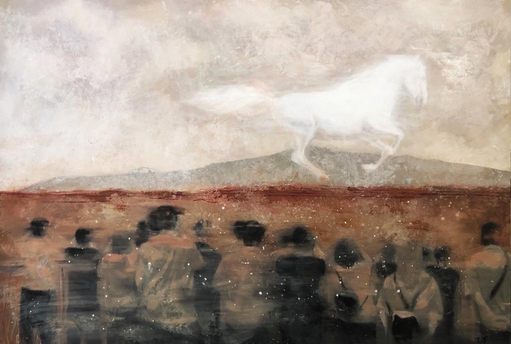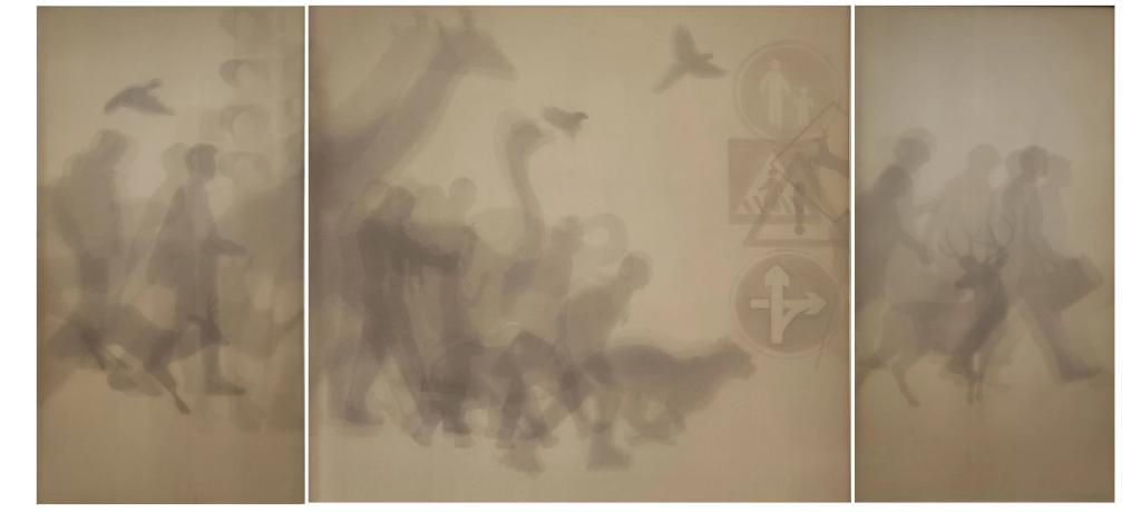 作品简介:现代社会,生活节奏不断加快,人们未来生存而四处奔走,动物也未来适应环境而迁徙。本作品描绘了一幅人与动物正在奔走的场景,各种姿态的光影相互重叠、交织,所呈现的画面引人深思。