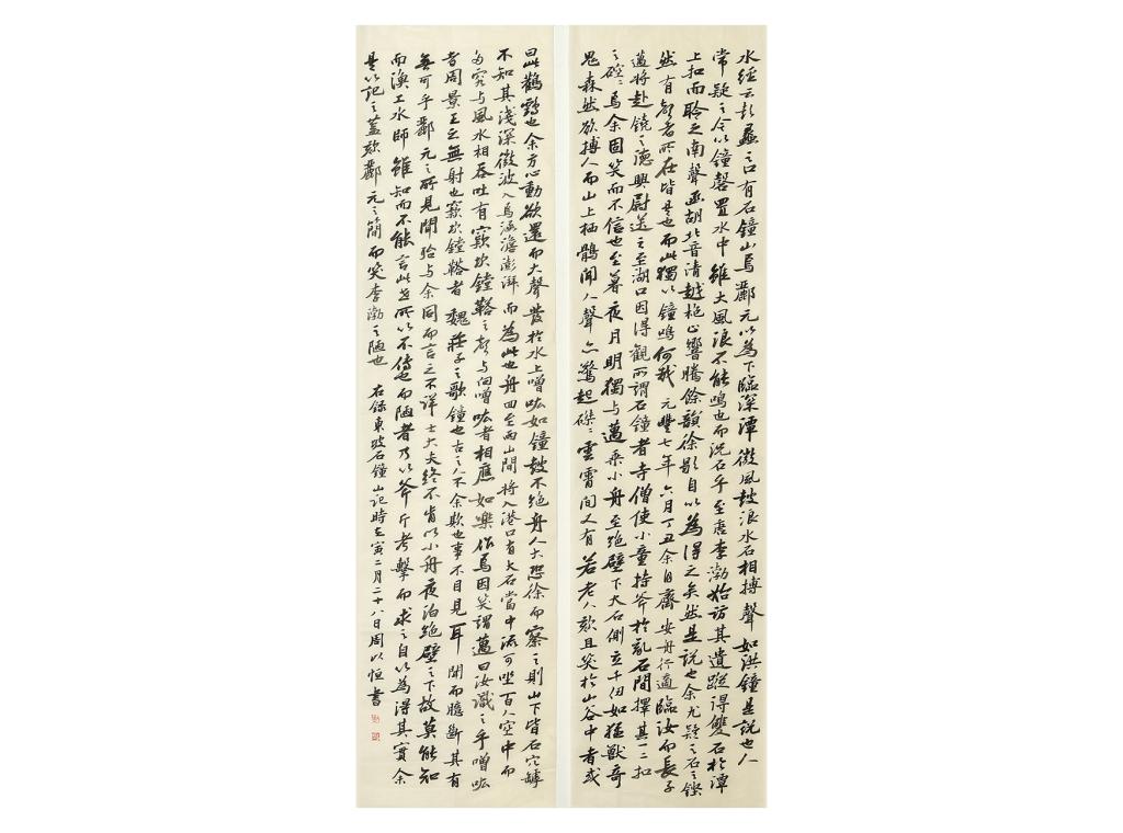 作品简介:本作品拟苏东坡笔意,以苏东坡《石钟山记》为内容,表达对东坡居士豁达乐观主义的向往之情。作品形式为四尺二条屏。