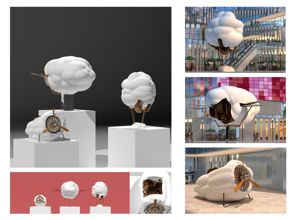 作品简介:这是一组外形是云和机械相结合的公共艺术作品。但这个作品表达的不仅是一组机械机构,也不仅仅是一组机械和自然结合的一个造型。这组作品表达的是一种勇于探索的精神。这个探索是人类对天空的探索和对整个世界的探索,也包括对艺术的探索。