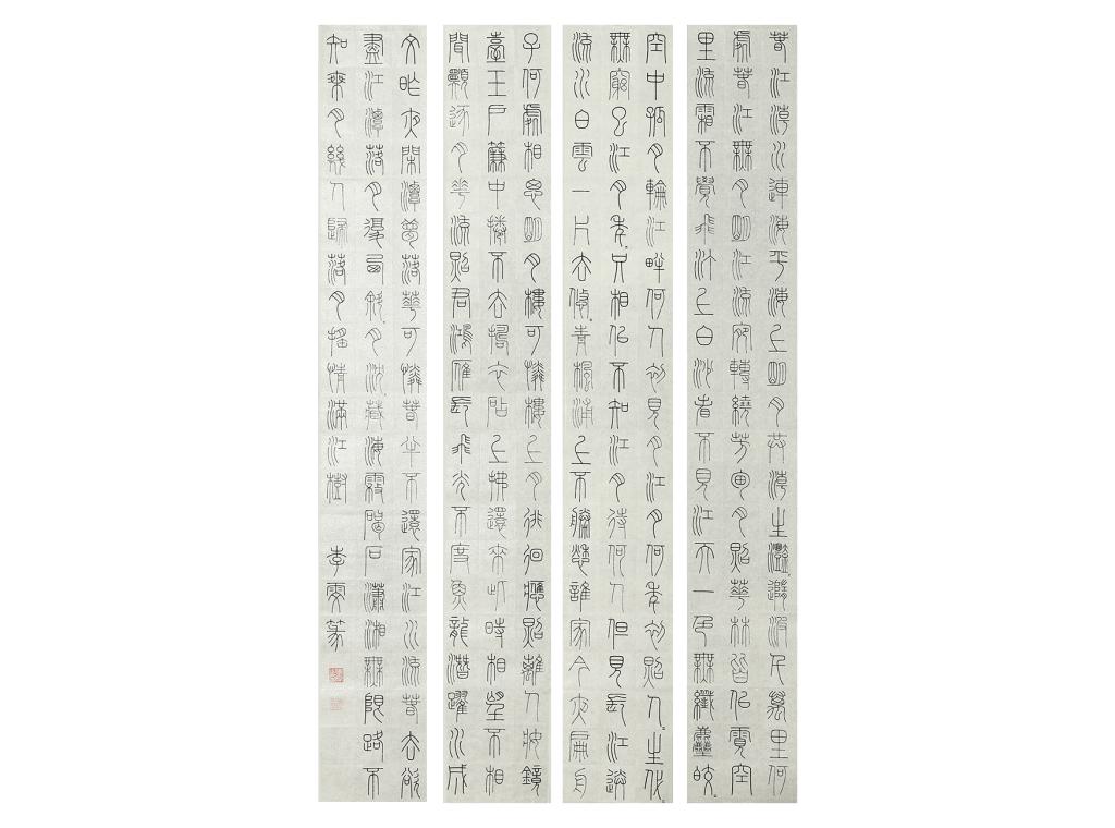 作品简介:作品创作内容选取唐人张若虚《春江花月夜》一诗,取法李斯《峄山碑》,以峄山碑的婉转通畅、遒劲圆润来应和春江花月夜“孤篇盖全唐”工整清丽的风采。